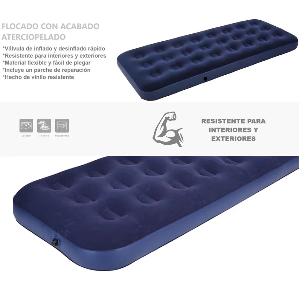 ¡Descubre la comodidad portátil con nuestros Colchones Inflables Individuales! Perfectos para camping, viajes, o como cama adicional en casa, estos colchones están diseñados para ofrecerte un descanso placentero en cualquier lugar. Fabricados con material PVC resistente y con un acabado flocado superficial aterciopelado, garantizan suavidad y durabilidad. Su válvula de rápido inflado/desinflado facilita su uso y almacenamiento, mientras que su capacidad de soporte de hasta 150 kg asegura estabilidad y firmeza. Además, incluye un parche de repuesto para reparaciones rápidas en caso de roturas. ¡Ideal para exteriores e interiores!