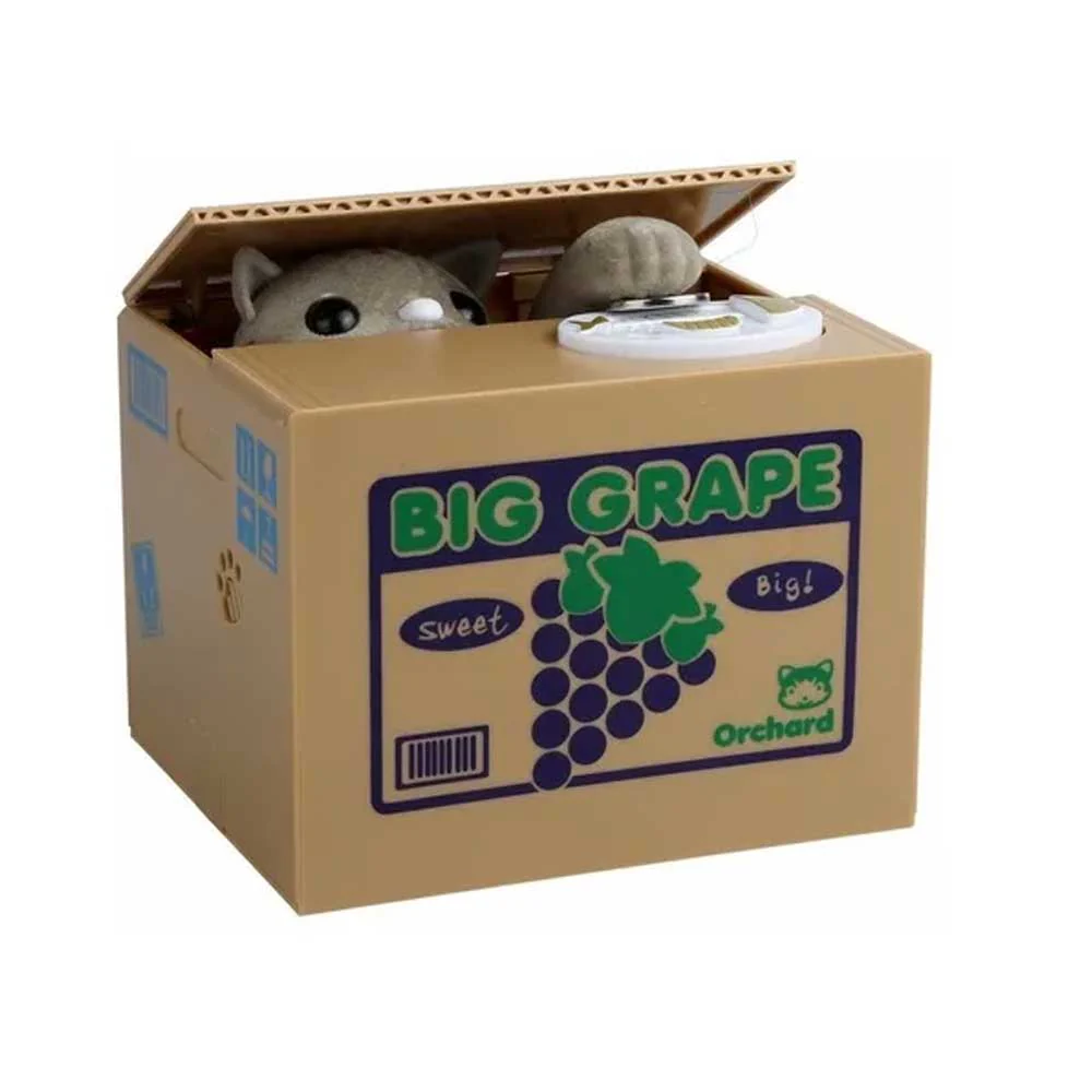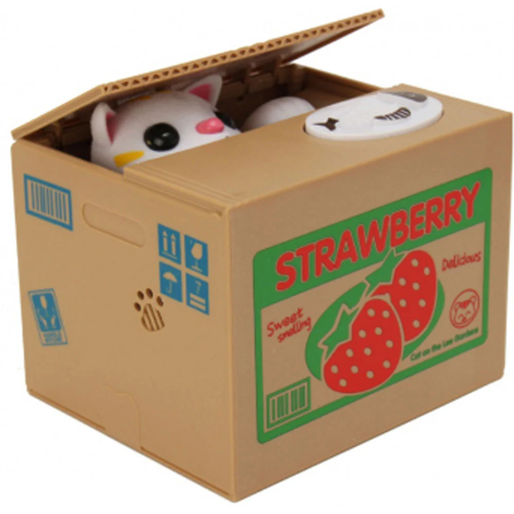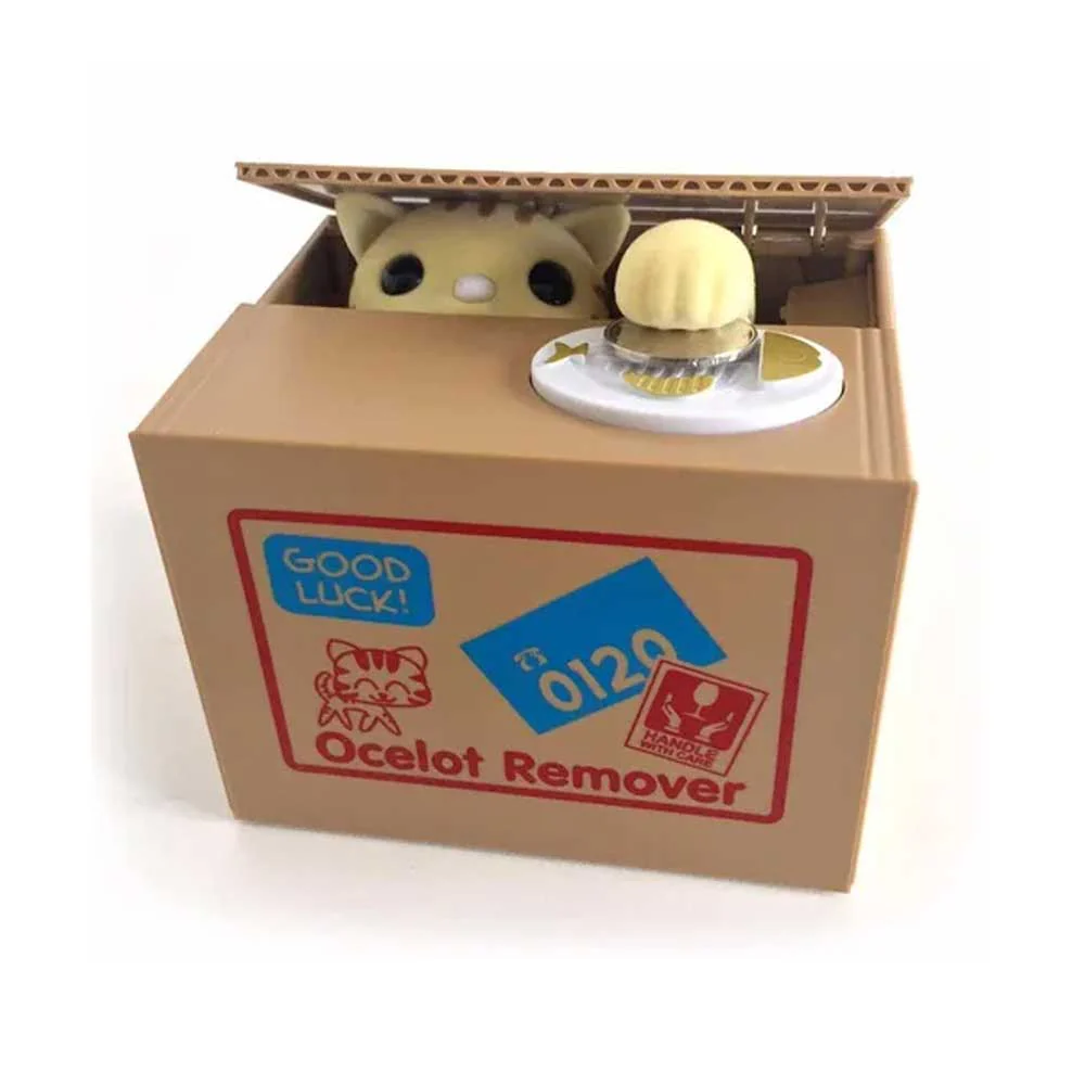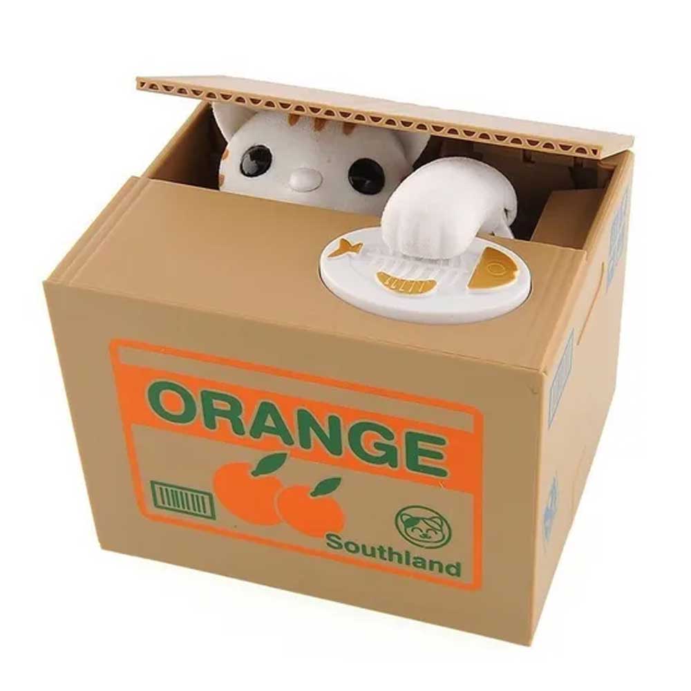 - Ahorra dinero de manera divertida con esta alcancía robamonedas en forma de gatito blanco y naranja. Esta alcancía de gato lindo es un juguete divertido y práctico que ayuda a fomentar el hábito de ahorrar dinero.