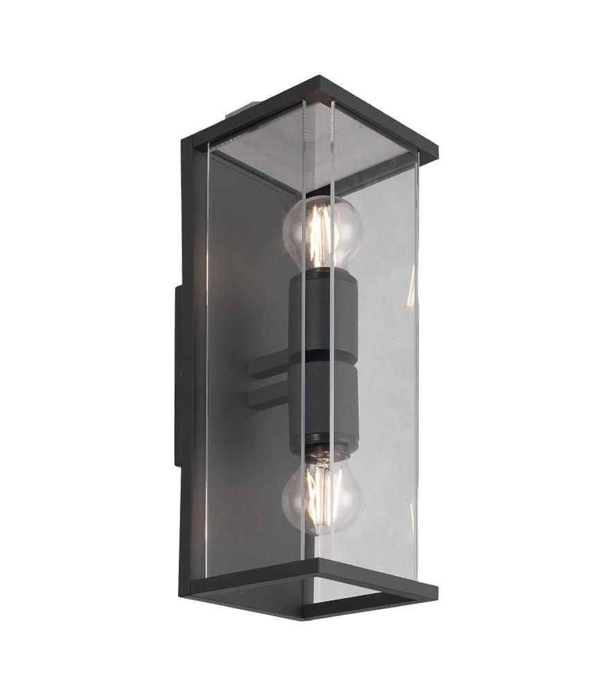Aplique para exterior con dos luces modelo MERIBEL. Iluminación decorativa y funcional ideal luminaria para el exterior del hogar con alta protección IP54. Acabado en color grafito. Diseño estilo moderno. Fabricada en aluminio y difusor de cristal. Voltaje 220-240V y fuente de luz 2 x E27 MAX 15W (no incl.).