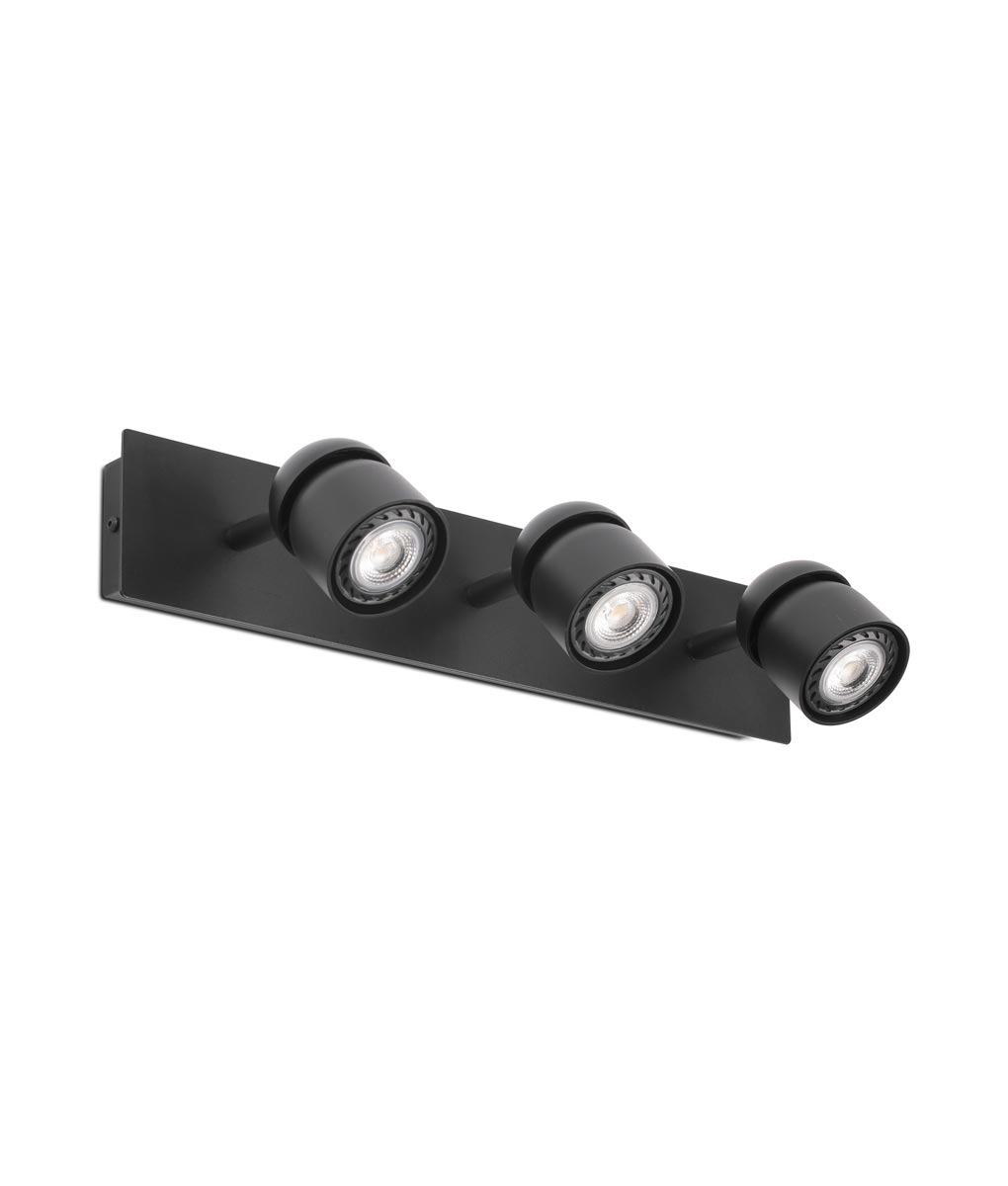 Lámpara aplique con tres focos orientable 350º en horizontal y 90º en vertical, modelo COCO. Acabado en negro. Fabricada en acero y ABS. Voltaje 100-240V y fuente de luz por 3 bombillas GU10 MAX 8W LED (no incl.).