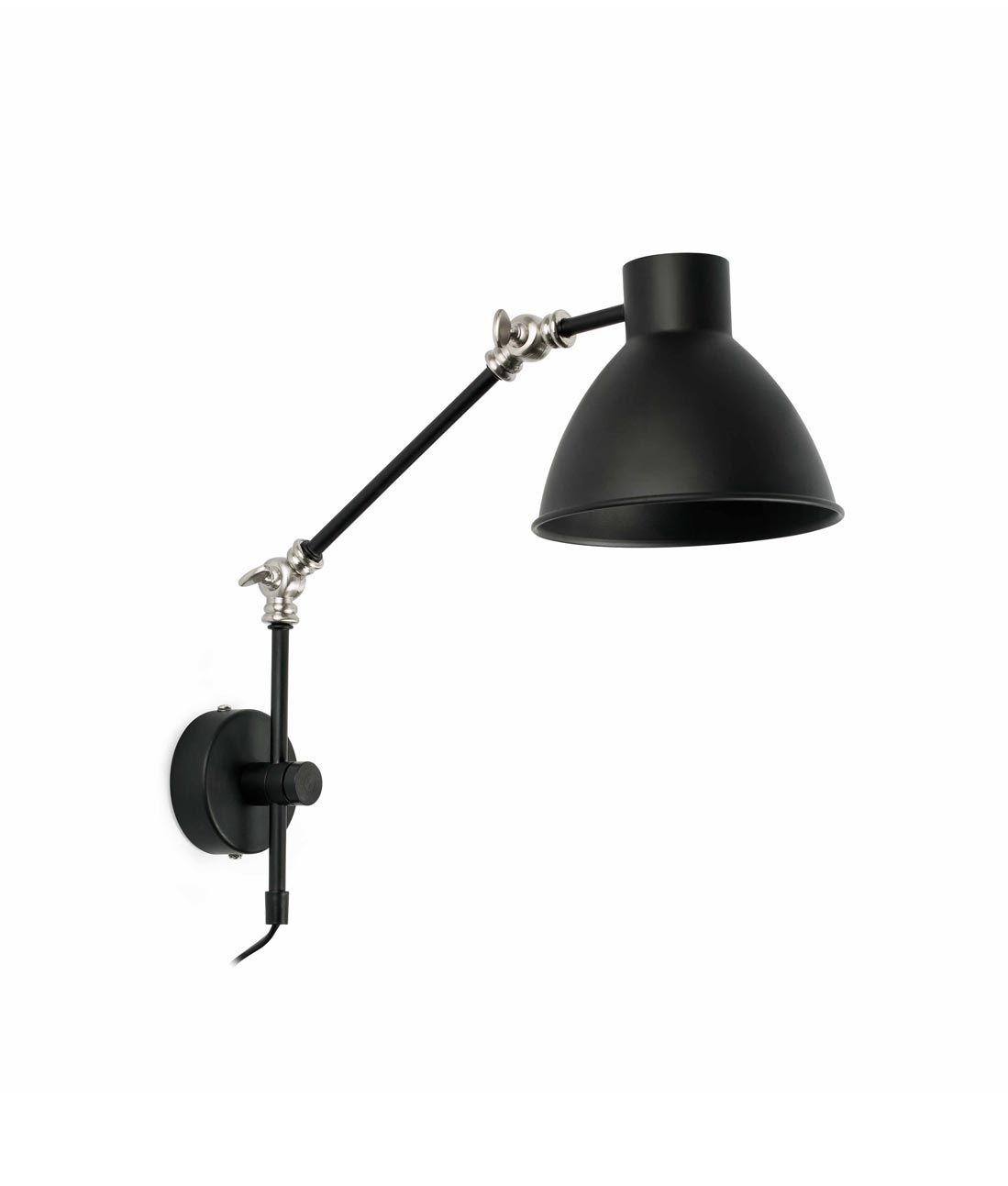Lámpara aplique de pared articulado con diseño vintage en acabado negro. Modelo CELIA. Fabricada en metal y acero. Voltaje 100-240V y fuente de luz 1 x E14 MAX 20W (no incl.).