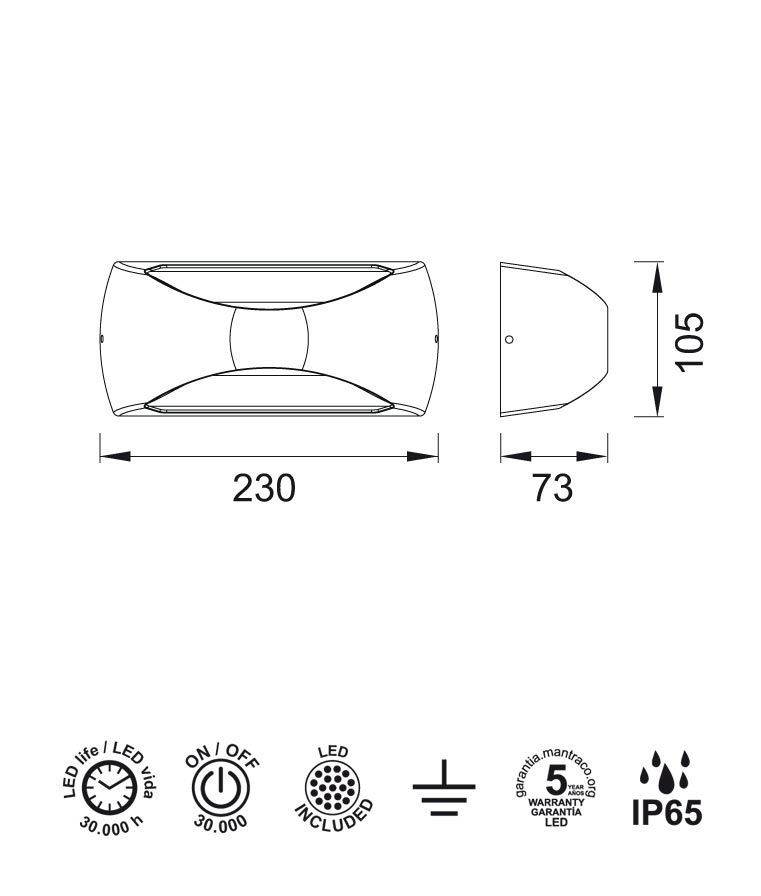 Lámpara aplique modelo Butan LED. Acabado en color blanco. Fabricada en aluminio y acrílico. Voltaje 220-240V y fuente de luz LED 12W luz cálida 3000K 1000Lm (incluida). 30.000 horas de uso.
