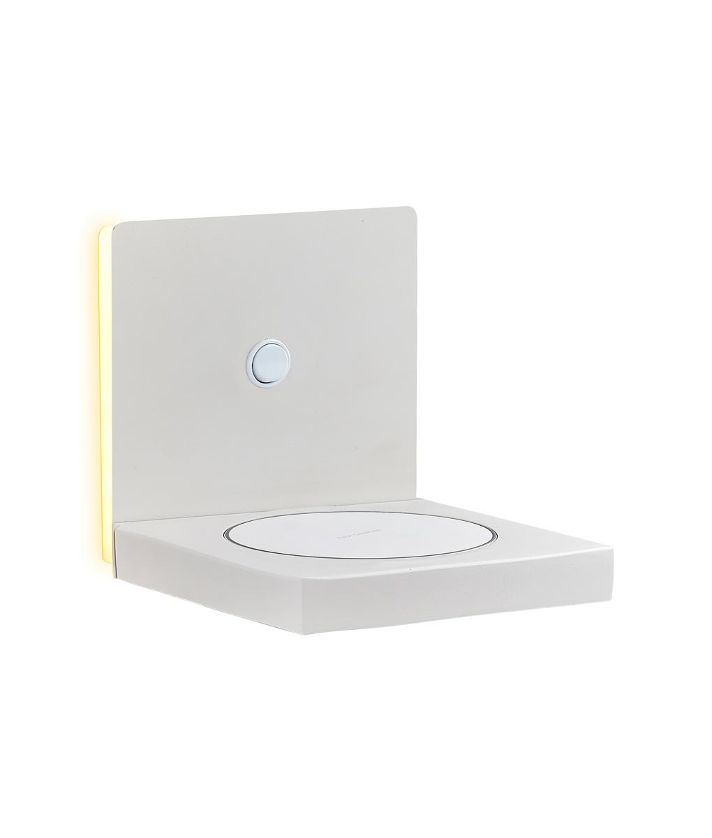 Aplique de dormitorio con cargador de móvil por inducción, modelo ZANZIBAR. Luz indirecta. Ideal para la iluminación de acompañamiento de cabeceros de cama. Acabado en color blanco mate. Fabricada en aluminio. Voltaje 220-240V y fuente de luz cálida LED de 3W 3000K 210 Lm (incl.).