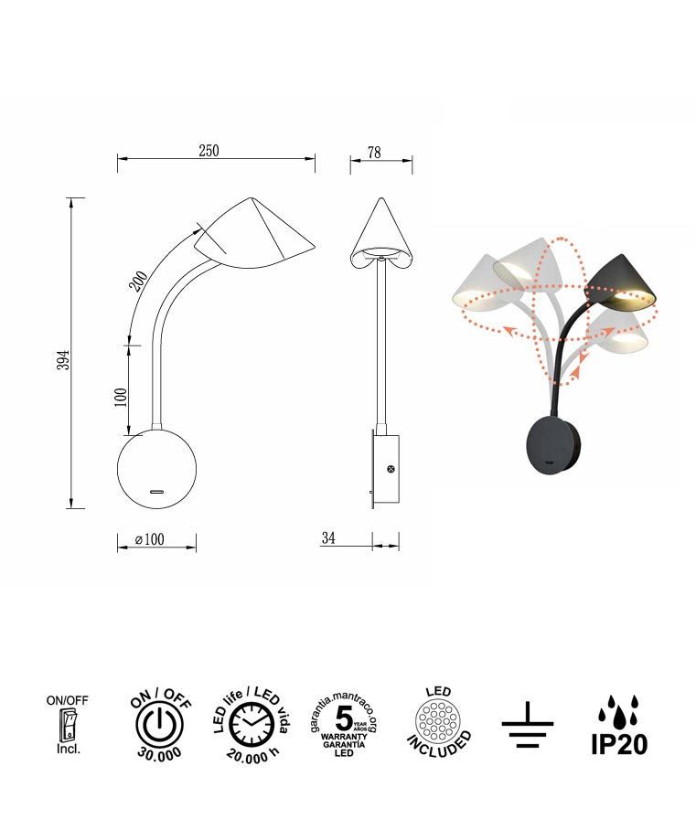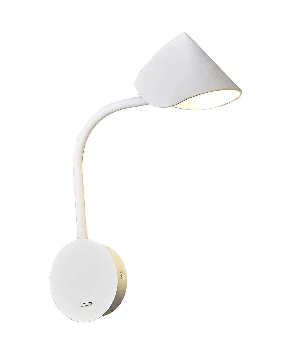 Aplique de diseño moderno con cabezal articulable e interruptor incorporado, modelo GOA LED. Ideal para la iluminación decorativa del dormitorio. Acabado en color blanco. Fabricada en aluminio. Voltaje 100-240V y fuente de luz cálida LED 7,5W 3000K 660LM (incluida).