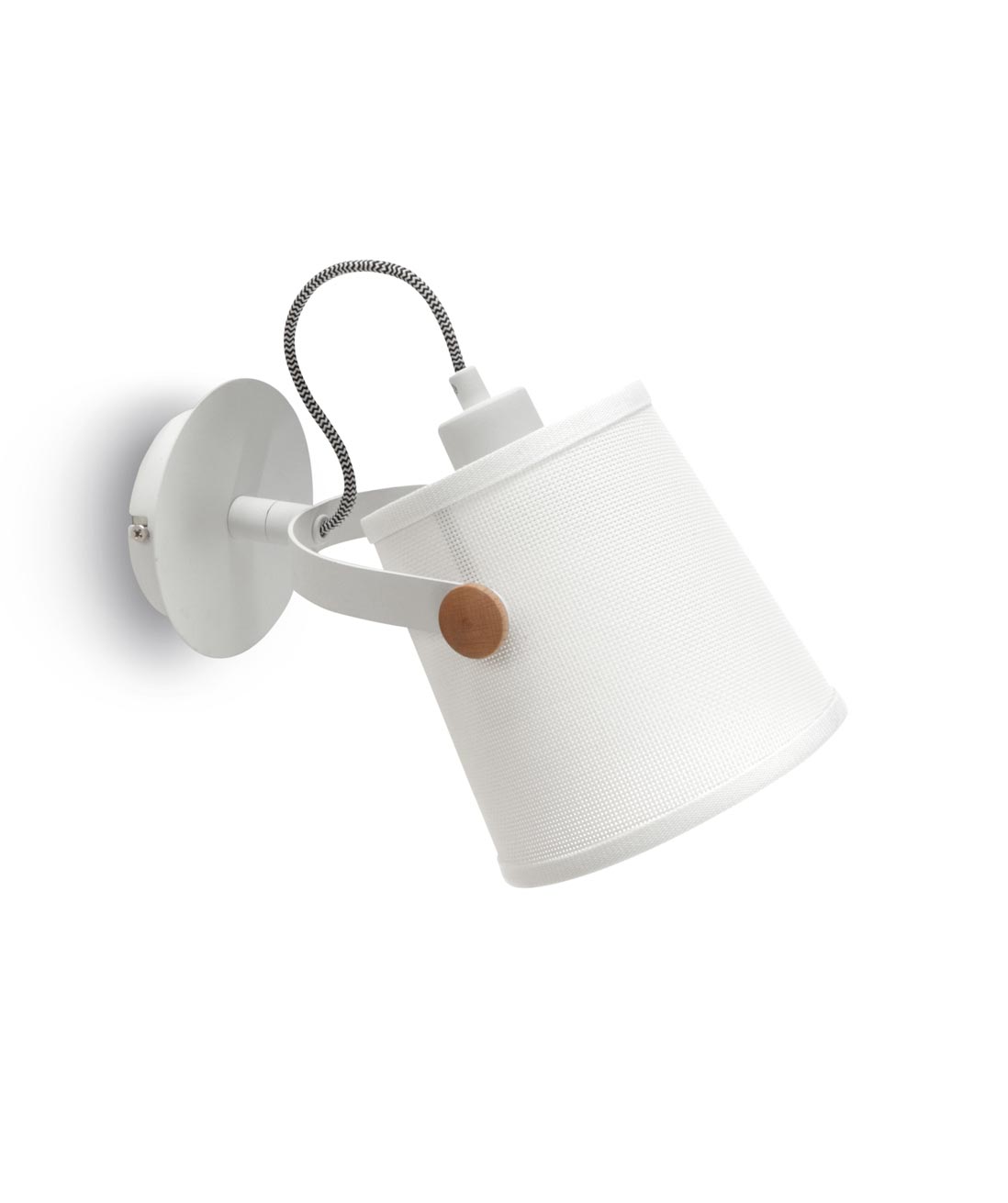 Aplique blanco NORDICA que combina metal blanco y madera natural con pantalla en blanco roto. Iluminación mediante 1 luz E27 (no incl.). También disponible con acabados en negro.