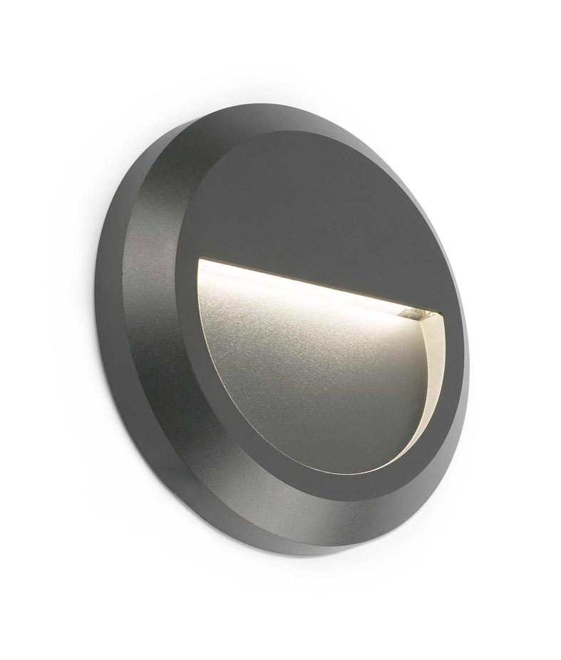 Aplique circular GRANT LED de la marca Faro. Diseño moderno ideal para la iluminación decorativa de jardines, terrazas y señalización. Color gris oscuro. Fabricada en ABS y policarbonato. Protección alta IP65 contra la lluvia y cuerpos sólidos. Iluminación por SMD LED 1W 3000K 65Lm (incl.). Transformador driver incluido.