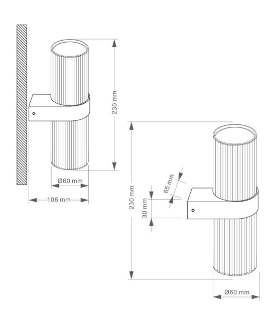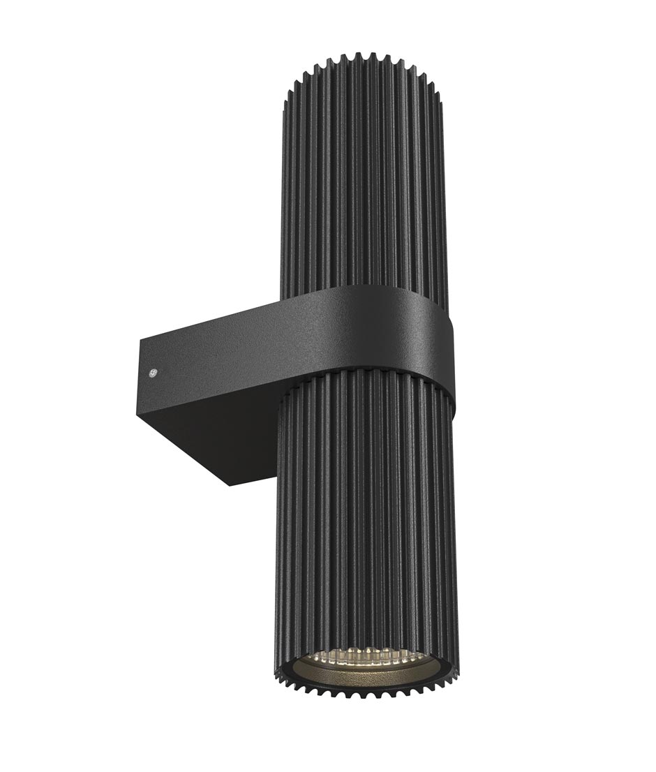 Aplique modelo Dynamics. Acabado en color negro mate. Fabricado en aluminio y cristal. Voltaje 220-240V y fuente de luz 2 bombillas GU10 MÁX 15W LED (no incluidas).
