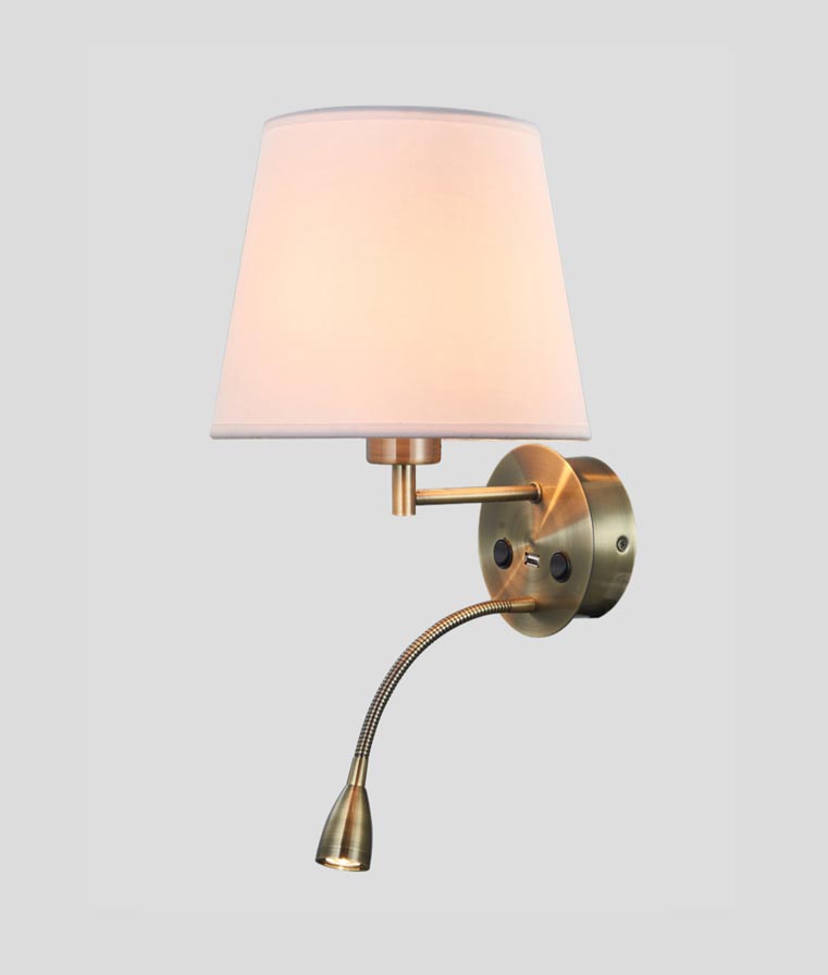 Lámpara aplique de pared con lector LED y entrada usb, modelo CAICOS. Acabado en color cuero (oro envejecido). Diseño moderno, ideal para la iluminación de dormitorios y salones. Fabricada en aluminio. Voltaje 220-240V y fuente de luz cálida 1 x E27 MAX 20W (no incl.) + LED 3W 3000K (incl.).