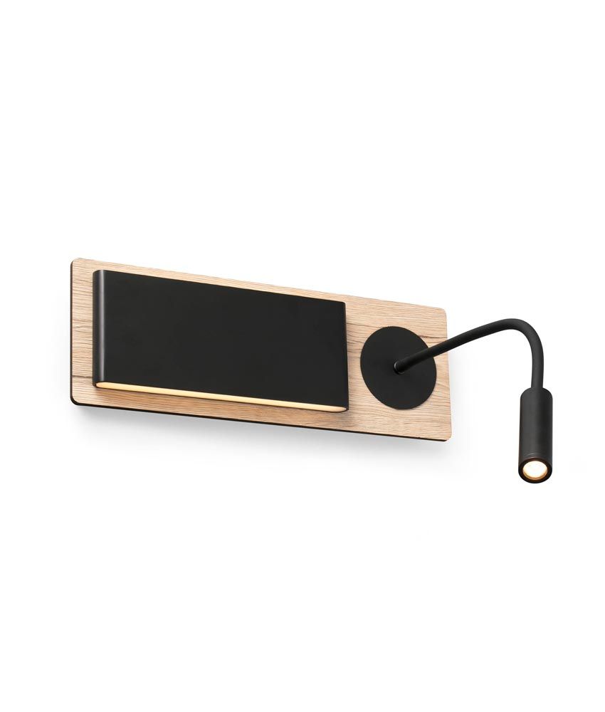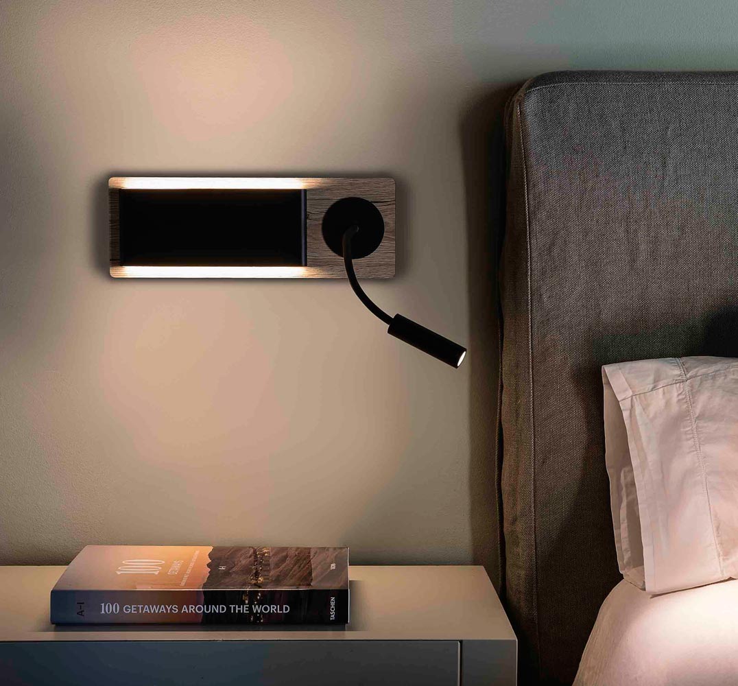 Aplique de pared modelo MOOD LED. Ideal para iluminar espacios de lectura en salones, dormitorios y en la instalación de hoteles junto a la cama. Acabado en color negro y base de madera. Diseño estilo moderno con un aire nórdico. Fabricada en metal y madera. Voltaje 100-240V y fuente de luz LED 2 x 3W 3000K luz cálida + 1,5W Lector (incl.).