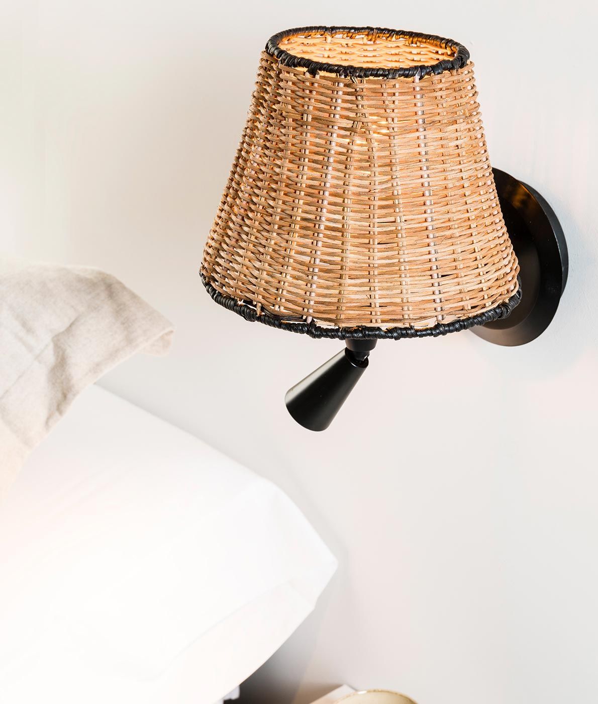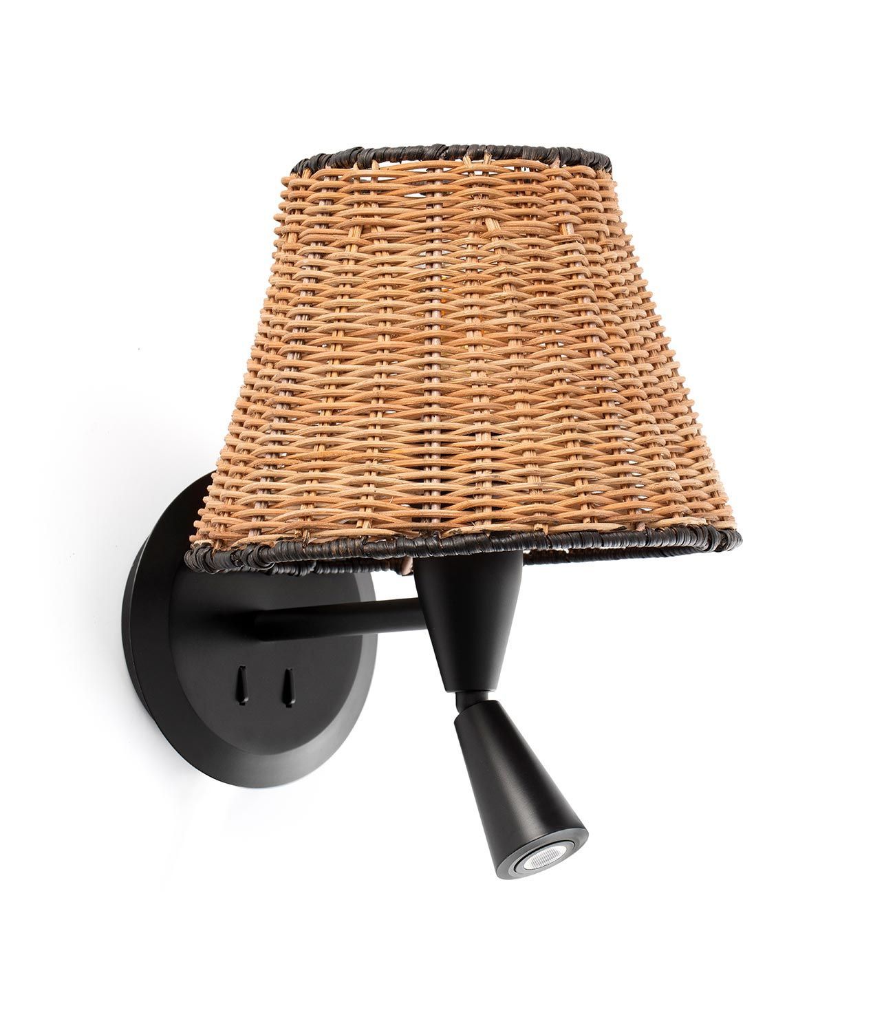 Lámpara aplique con lector LED de diseño estilo rústico, modelo SUMBA. Ideal para la iluminación del dormitorio. Acabado en color negro y ratán. Fabricada en acero y tulipa de ratán. Voltaje 100-240V y fuente de luz por una bombilla E27 máx. 15W LED (no incluida). Luz lector LED incluida 3W 3000K 280Lm (incluida).