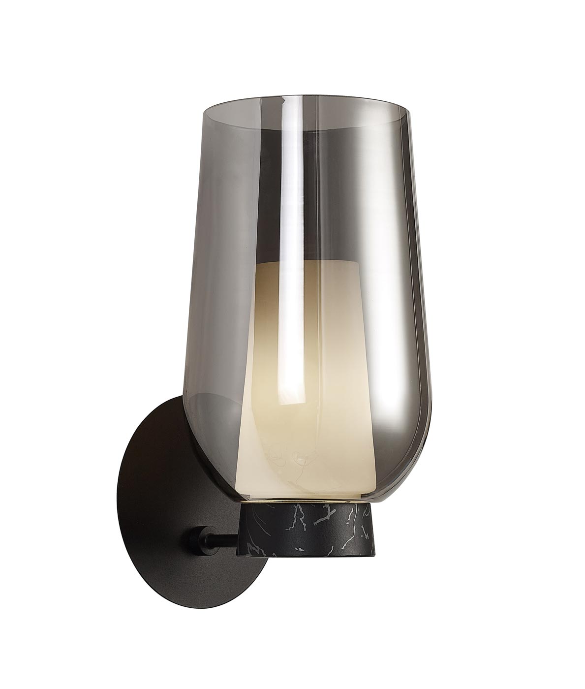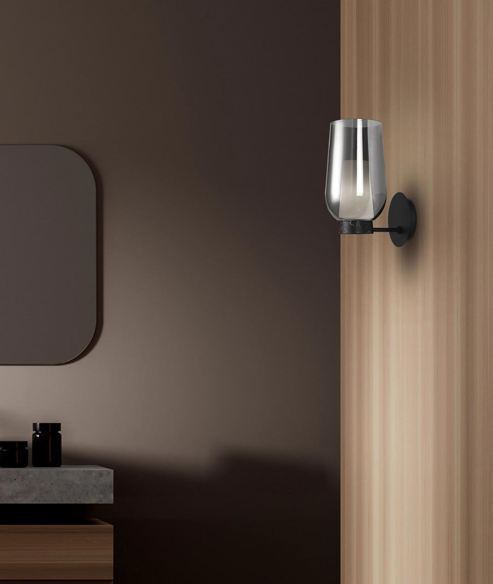 Aplique de pared de cristal modelo Nora. Acabado en color cristal ahumado y negro mármol. Fabricado en metal y cristal. Voltaje 220-240V y fuente de luz por 1 bombilla E27 MÁX 20W LED (no incluida).