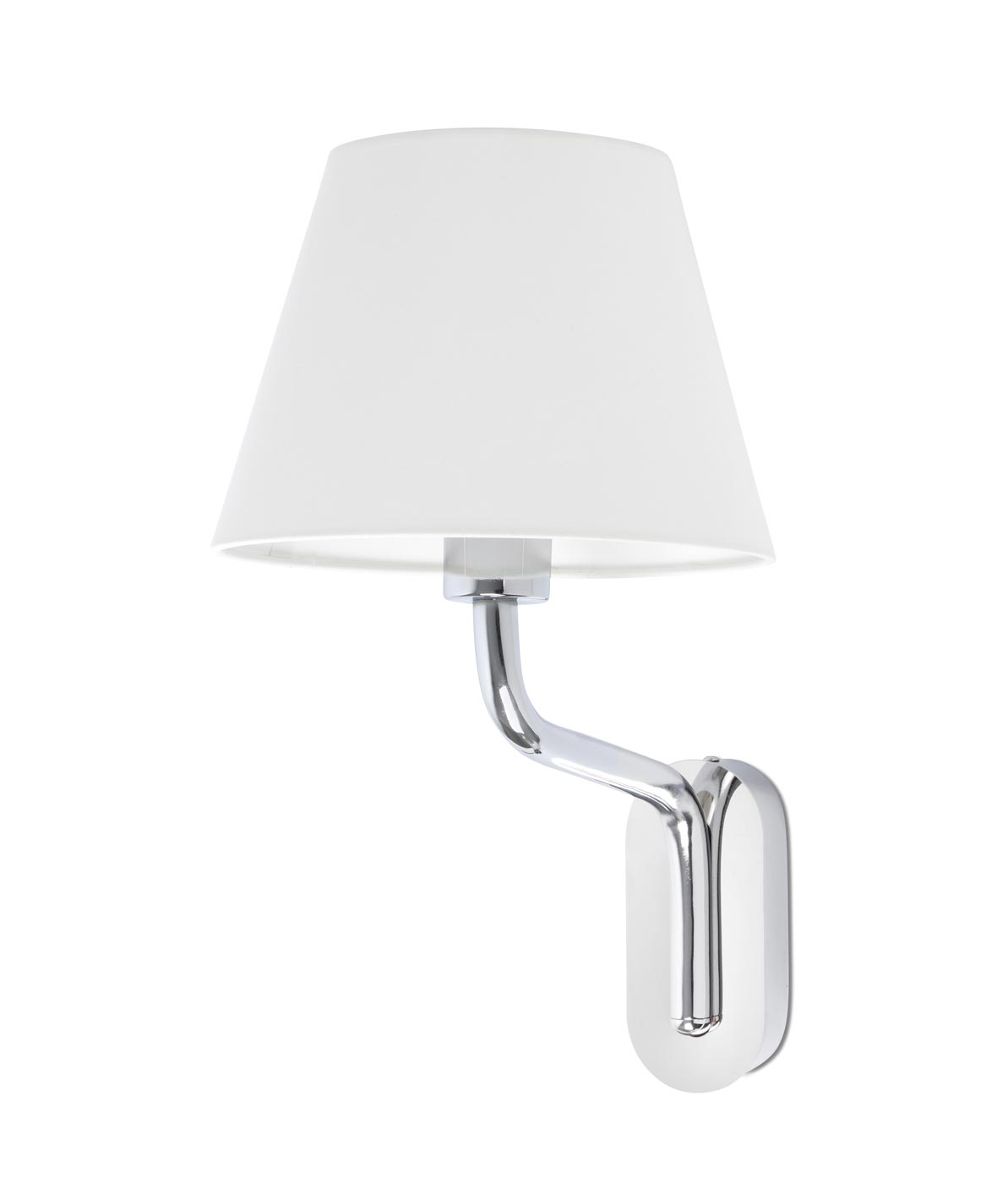 Aplique de diseño minimalista, modelo ETERNA. Ideal para la iluminación decorativa de espacios contract y hoteles. Fabricado en metal. Acabado en cromo y pantalla blanca. Voltaje 100-240V y fuente de luz por una bombilla E27 MÁX 15W LED (no incluida).