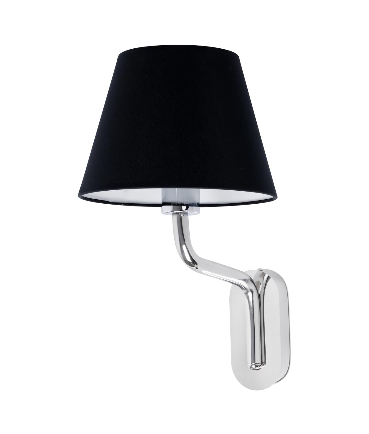 Lámpara aplique de diseño minimalista, modelo ETERNA. Ideal para la iluminación decorativa de espacios contract y hoteles. Fabricado en metal. Acabado en cromo y pantalla negra. Voltaje 100-240V y fuente de luz por una bombilla E27 MÁX 15W LED (no incluida).