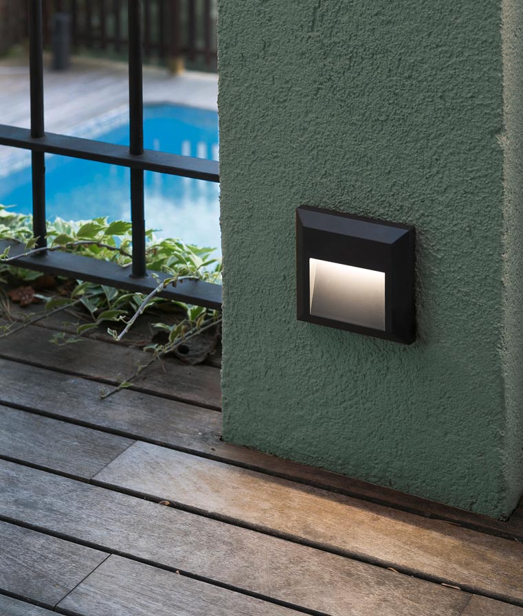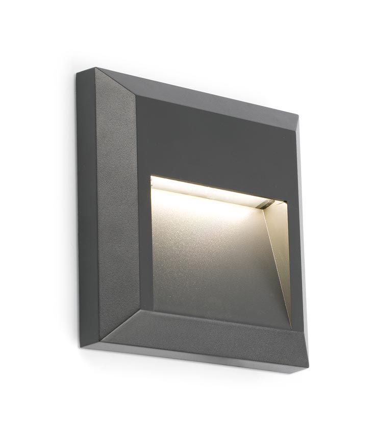 Aplique cuadrado GRANT de la marca Faro. Diseño moderno ideal para la iluminación decorativa de jardines, terrazas y señalización. Color gris oscuro. Fabricada en ABS y policarbonato. Protección alta IP65 contra la lluvia y cuerpos sólidos. Iluminación por SMD LED 1W 3000K 65Lm (incl.). Transformador driver incluido.