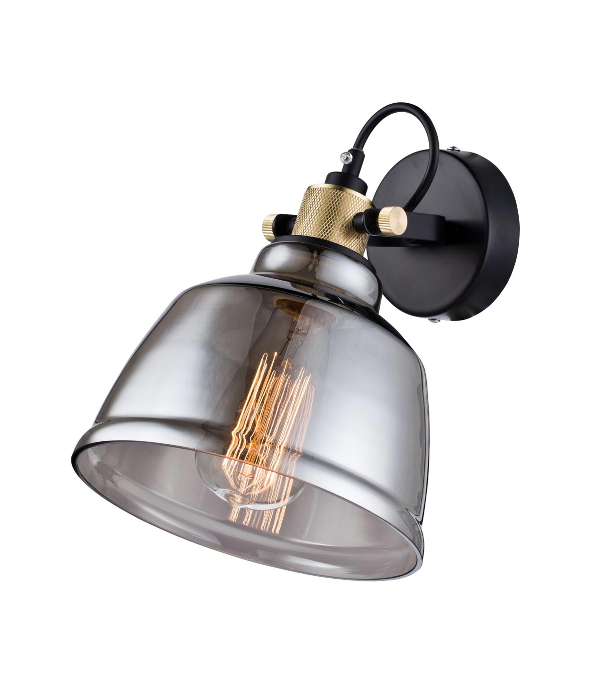 Aplique estilo vintage, modelo IRVING. Ideal para la iluminación decorativa. Acabado en color cristal gris humo, negro y latón. Fabricada en metal y cristal. Voltaje 220-240V y fuente de luz por 1 bombilla E27 MÁX 40W (no incluida).