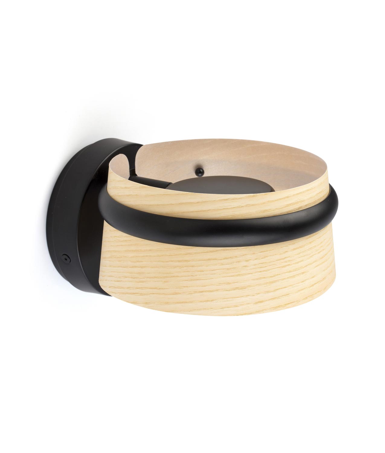 Lámpara aplique regulable en intensidad desde interruptor de pared (no incluido), modelo LOOP LED. Ideal para la iluminación decorativa de espacios de interior como salones, pasillos y habitaciones de hoteles. Fabricado en madera de fresno y metal. Acabado en color negro y fresno. Voltaje 100-240V y fuente de luz LED dimable 6W luz cálida 2700K 500Lm.