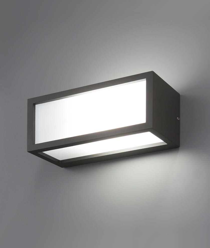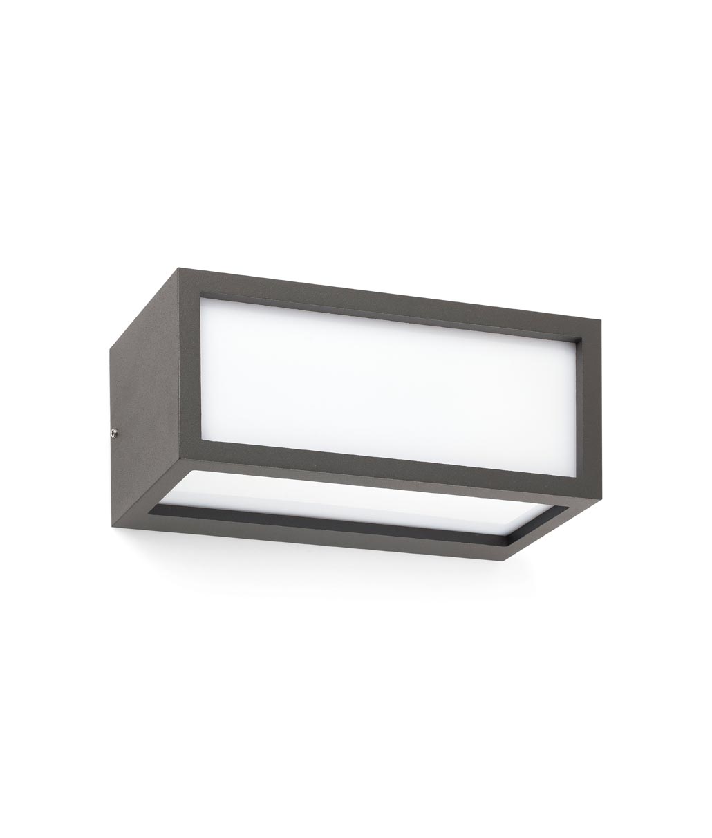 Aplique diseño moderno TEJO para iluminación exterior de la marca Faro. Ideal para iluminación decorativa y funcional. Color gris oscuro. Fabricada en aluminio inyectado y difusor de policarbonato opal. Iluminación por 1 x E27 20W (no incl.).
