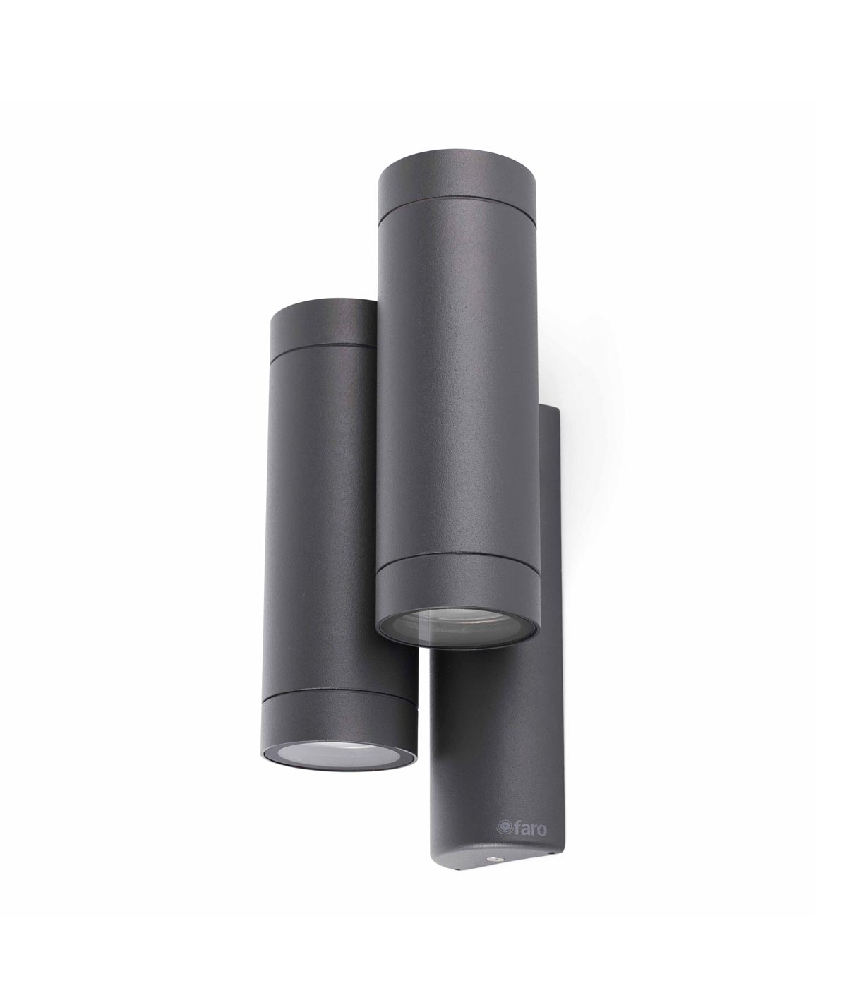 Aplique doble luz STEPS de la marca Faro. Lámpara de diseño moderno, ideal para la iluminación de exteriores. Fabricada en aluminio y difusor de cristal templado. Color gris oscuro. Iluminación por 4 x GU10 35W (no incl.).