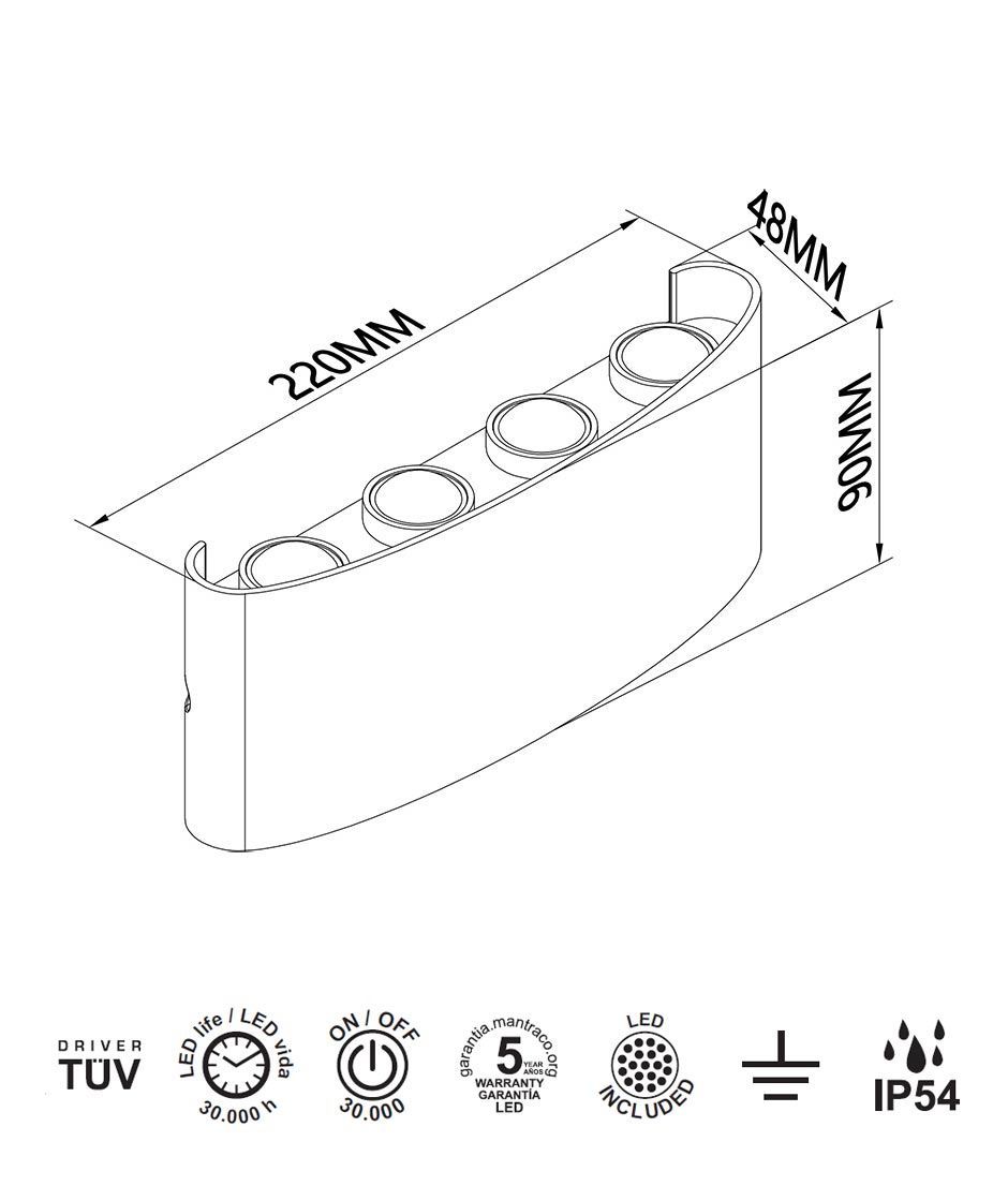 Aplique de pared exterior con IP54, modelo ARCS. Ideal para la iluminación de espacios exteriores. Acabado en color gris oscuro. Fabricada en aluminio y cristal. Voltaje 220-240V y fuente de luz cálida LED de 8W 3000K 830 Lm (incl.).