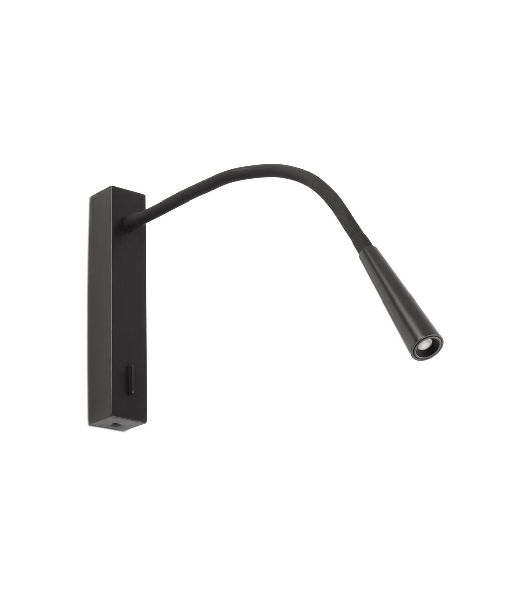 Aplique de lectura con brazo articulado, modelo FLIN LED. Acabado en negro. Fabricada en aluminio y acero. Voltaje 100-240V y fuente de luz cálida LED 3W 3000K 280Lm (incl.).