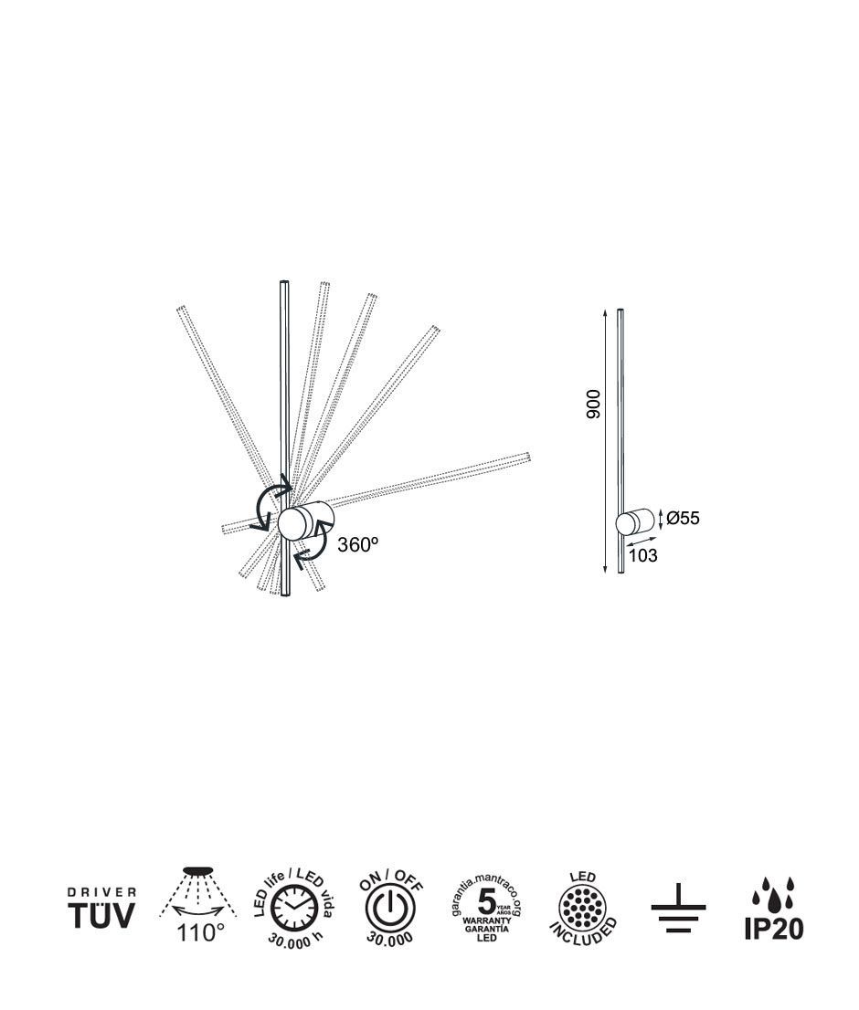 Lámpara aplique de diseño moderno y minimalista giratorio 360º, modelo TOBAGO. Ideal para la iluminación decorativa. Acabado en color negro. Fabricada en aluminio. Voltaje 220-240V y fuente de luz cálida LED de 9W 3000K 760 Lm (incl.).