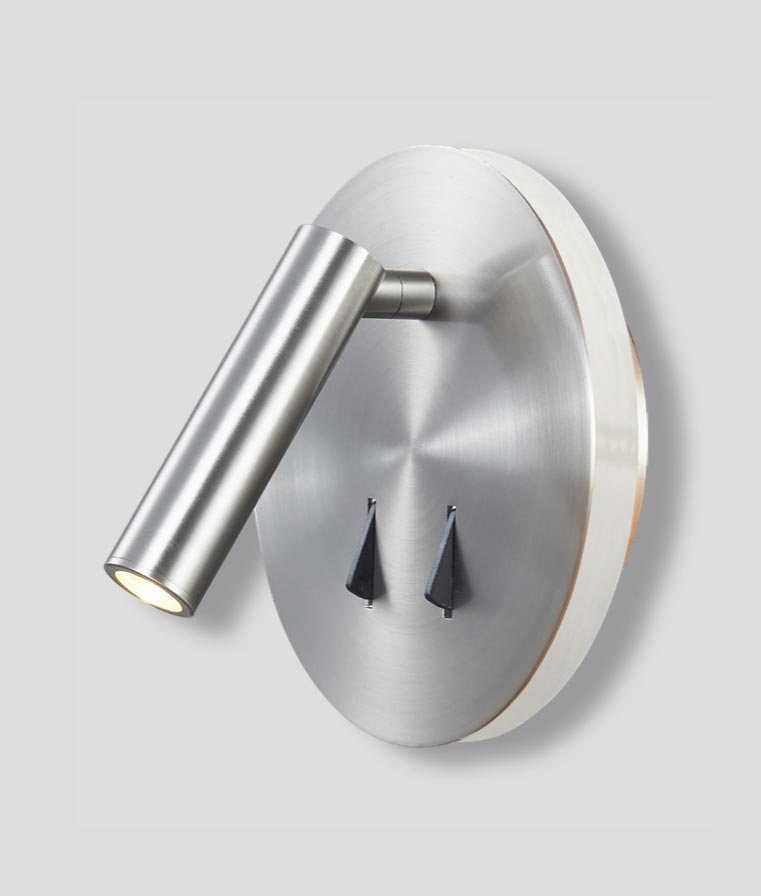 Lámpara aplique con tecnología LED, modelo CAYMAN. Acabado en color níquel satinado. Diseño moderno, ideal para la iluminación de dormitorios y salones. Fabricada en aluminio. Voltaje 220-240V y fuente de luz cálida LED 3W + 6W 3000K 210 + 410 Lm (incl.).