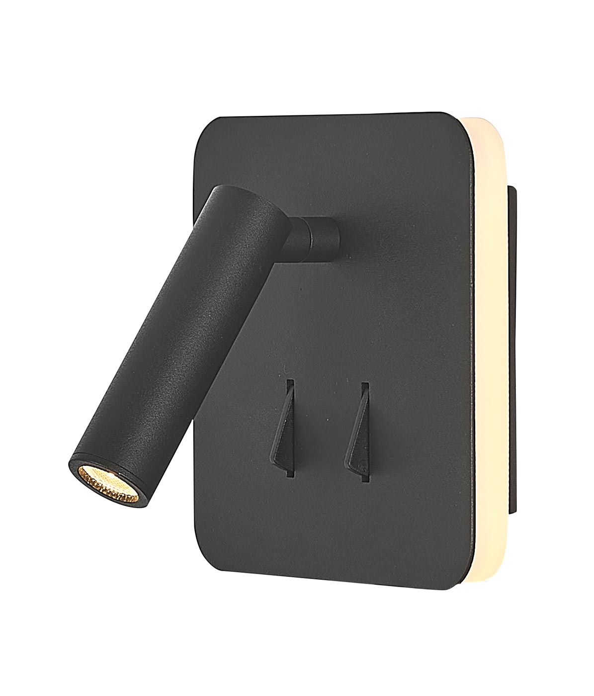 Lámpara aplique de diseño moderno y minimalista con interruptor y dos opciones de luces, modelo CAYMAN. Ideal para la iluminación del dormitorio y del cabecero de la cama. Acabado en color negro mate. Fabricada en aluminio. Voltaje 220-240V y fuente de luz cálida LED de 3+6W 3000K 210+410 Lm (incl.).