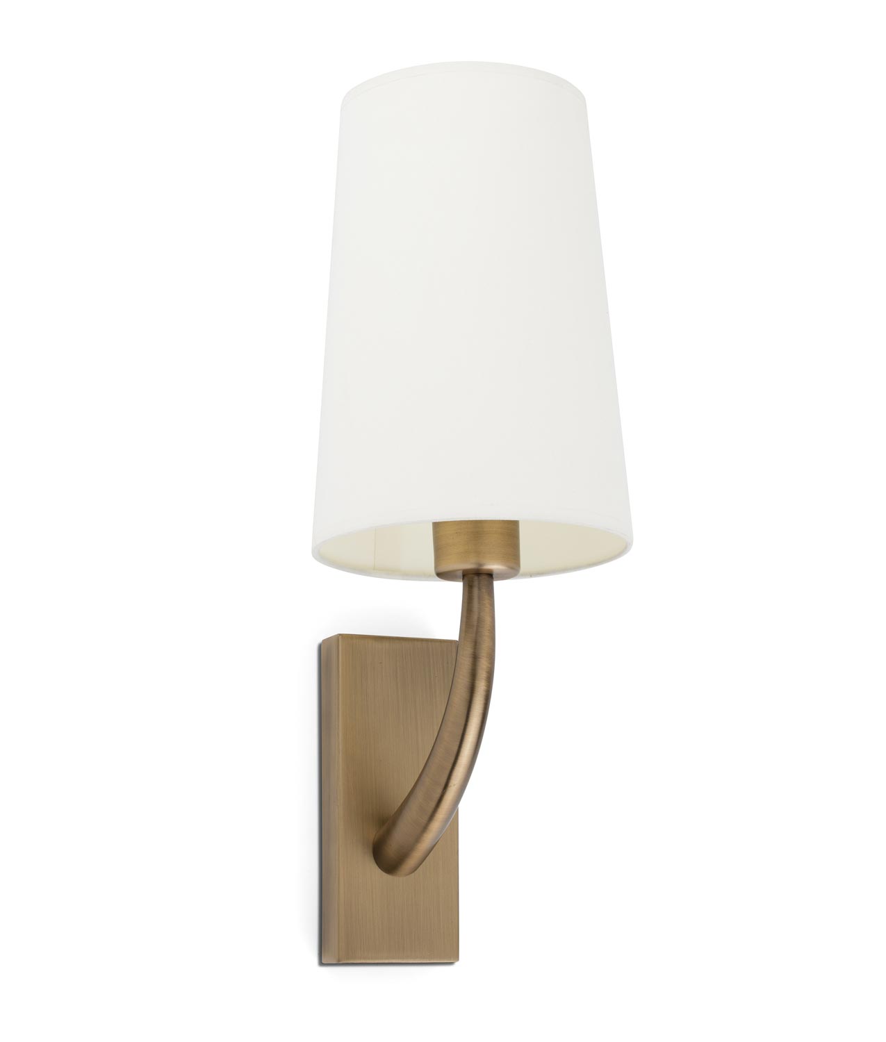 Aplique de pared de clásico renovado, modelo REM. Ideal para la iluminación decorativa de espacios contract. Fabricado en metal. Acabado en oro viejo mate y pantalla blanca. Voltaje 220-240V y fuente de luz por una bombilla E27 (no incluida).