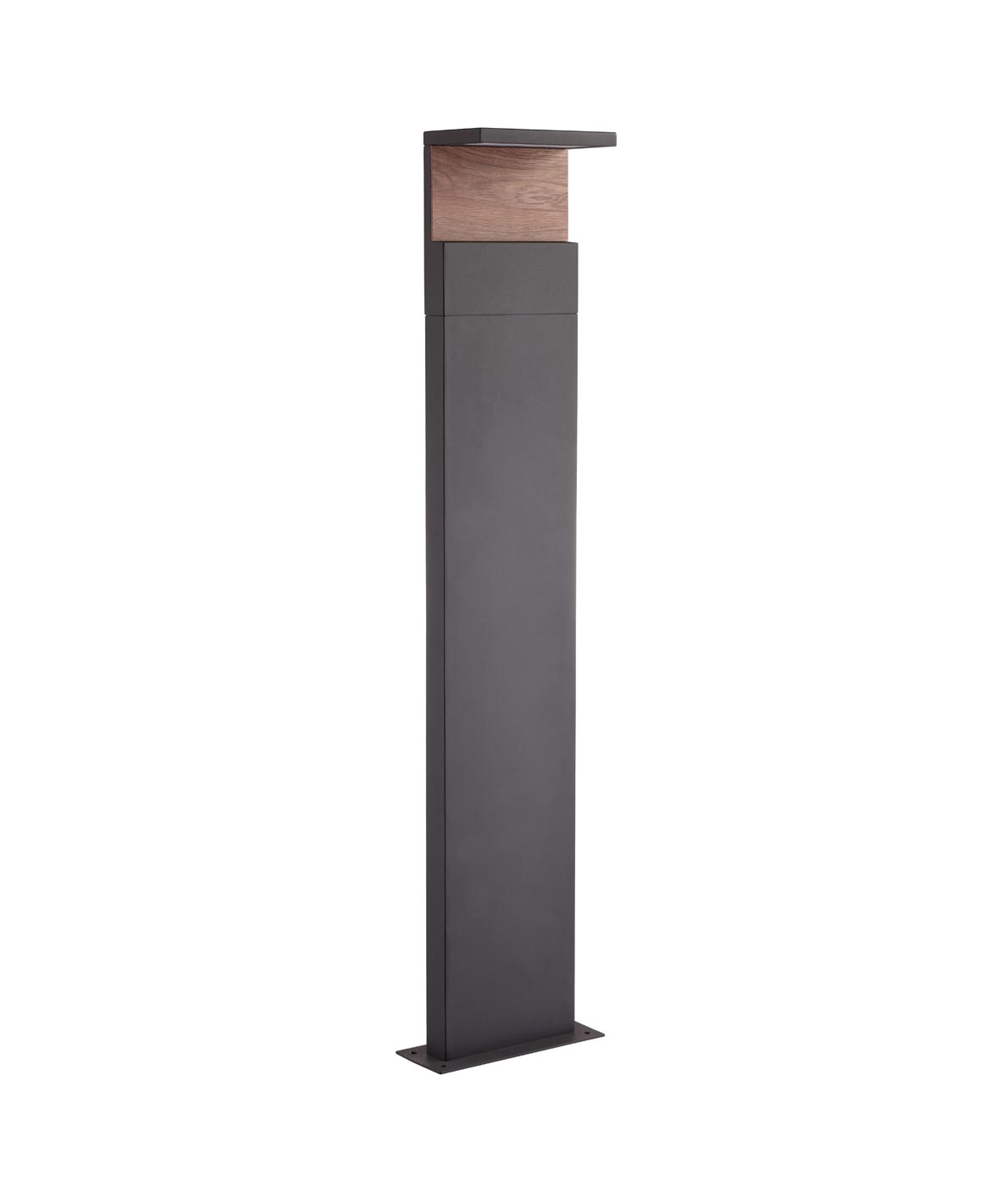 Lámpara baliza exterior de 100 cm de altura con alta protección IP54, modelo RUKA. Acabado en color gris oscuro y madera. Fabricada en aluminio. Voltaje 100-240V y fuente de luz cálida LED de 13W 3000K 980 Lm (incl.).
