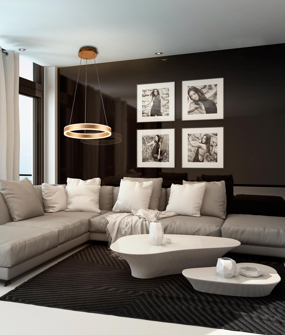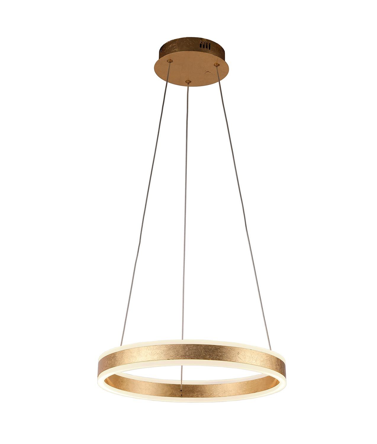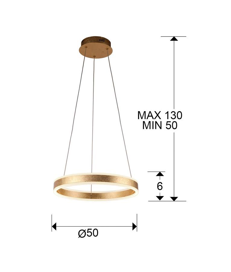 Lámpara techo LED de diseño moderno, modelo HELIA. Ideal para la iluminación interior. Realizada en metal y aluminio, acabado PAN DE ORO. Aro con difusor de acrílico opal. Altura regulable. Voltaje 220-240V y fuente de luz cálida por LED 55W 3000K 3300Lm (incluida).