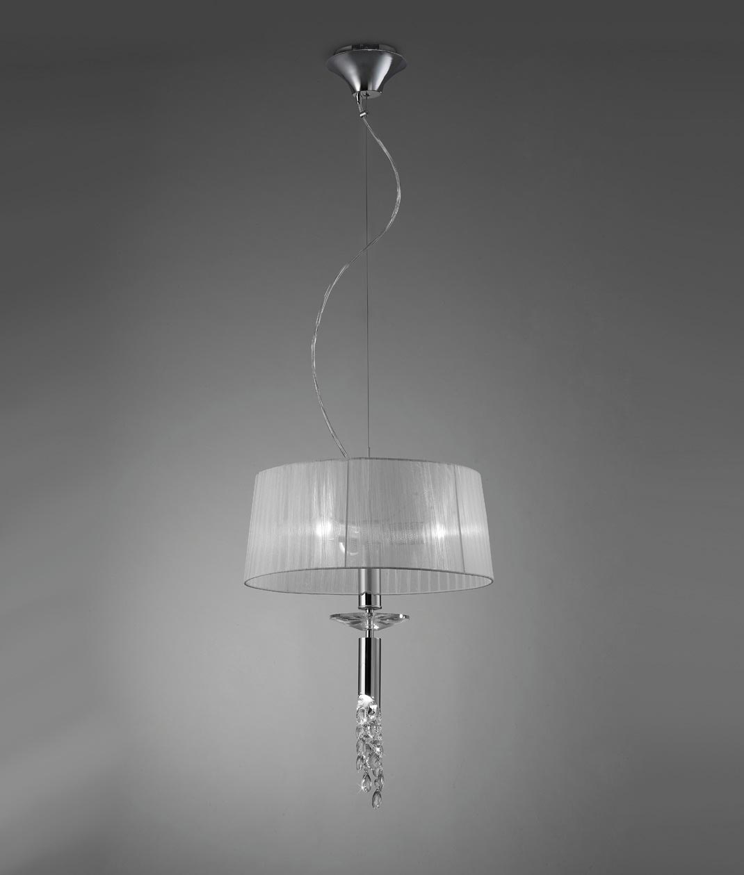 Colgante pequeño cromo TIFFANY con acabado en cromo y pantalla de organiza blanca. Iluminación mediante 3 luces E27 y 1 luz G9 (no incl.). También disponible con terminación en cuero envejecido y pantallas color coñac.
