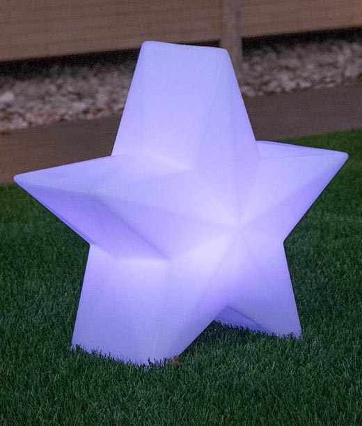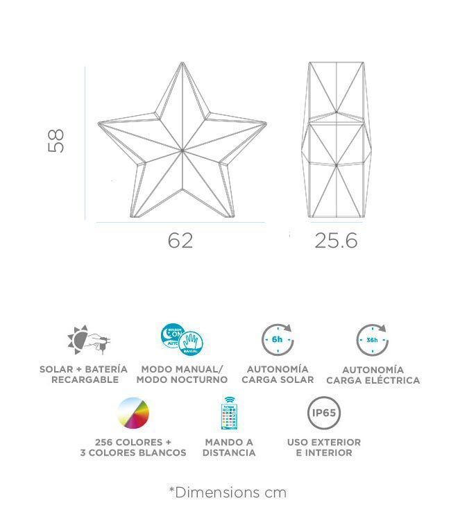 Estrella iluminada en su interior con 60 cm de altura para uso decorativo de interiores y exteriores con IP65. Luz LED RGB de 256 colores + 3 colores blancos con mando a distancia. Carga solar con autonomía de 6 horas y carga de la batería recargable eléctrica con autonomía de 36 horas. Fabricado en polietileno. Color blanco translúcido. Sea como sea NOVA será el elemento perfecto para iluminar cada rincón de tu hogar.