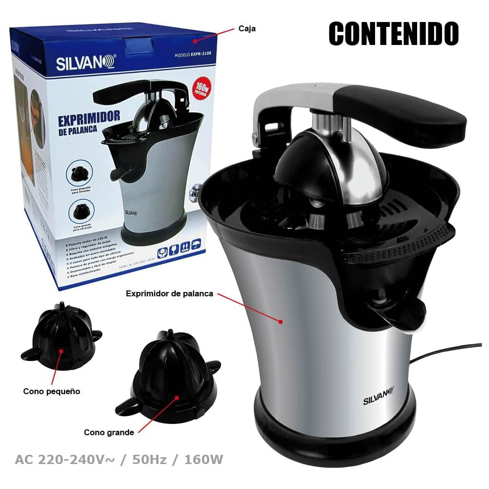 Exprimidor Eléctrico Silvano, Exprimidor de Naranjas con Palancas de Presión, Extractor Zumo 160W, Boquilla de Acero Inoxidable con Sistema Antigoteo, Base…