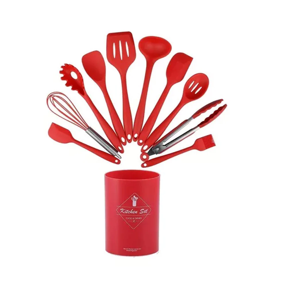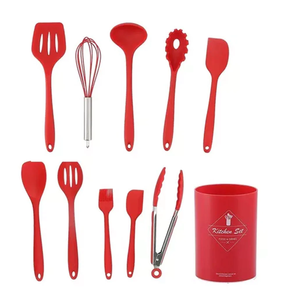 Set de utensilios de cocina de 11 piezas para cocinar, hornear y freír. Fabricado con silicona antiadherente y resistente para una cocina saludable. Diseño ergonómico y mango con aislamiento para mayor comodidad y facilidad de uso. Apto para lavavajillas para una limpieza fácil y rápida