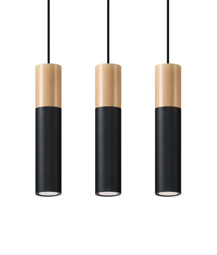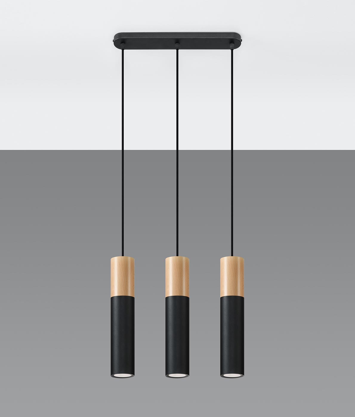 Lámpara con 3 luces modelo PABLO. Ideal para la iluminación decorativa. Acabado en color negro. Fabricada en acero y madera. Voltaje 220-240V y fuente de luz por 3 bombillas G10 LED MÁX. 12W (no incluida).