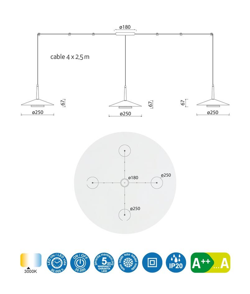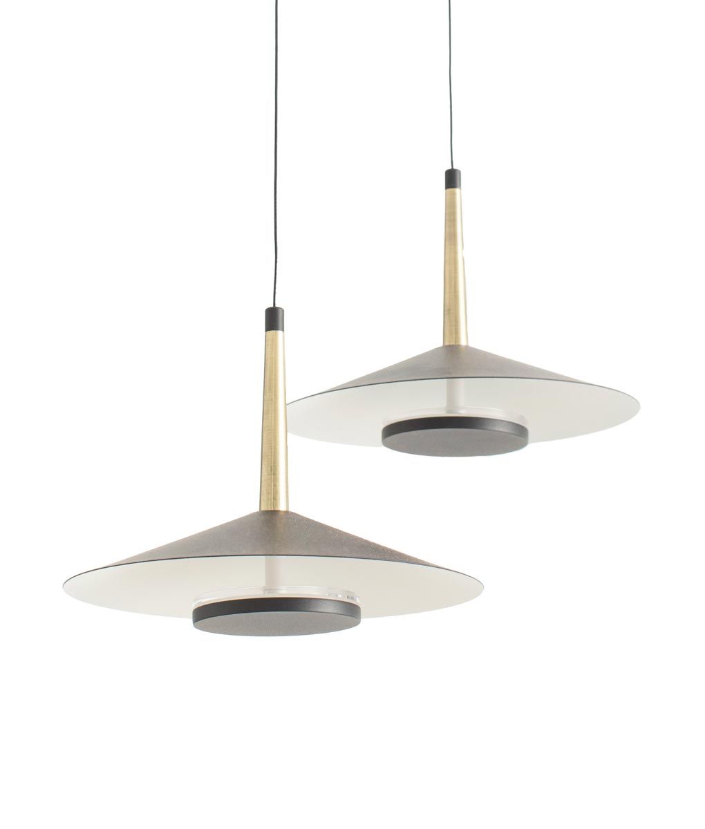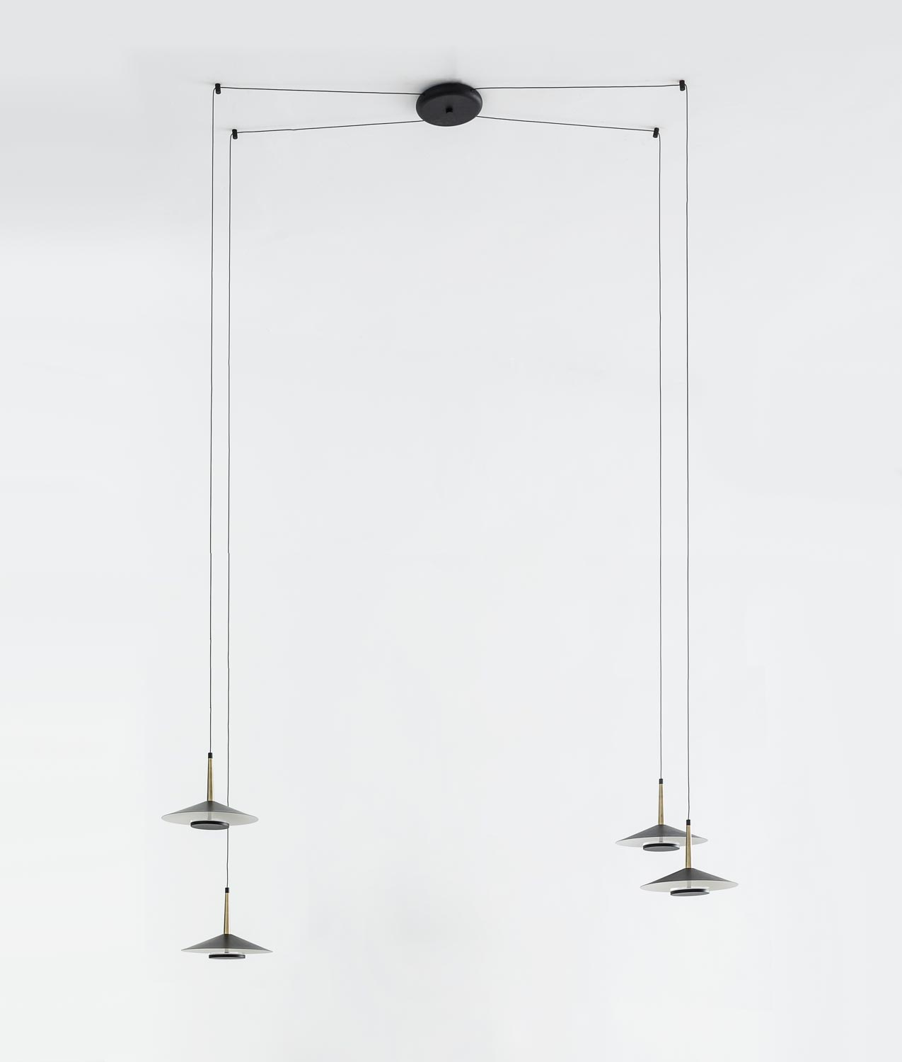 Colgante de techo con cuatro puntos de luz, estilo moderno y minimalista. Modelo ORION LED. Acabado en negro, cuero y latón envejecido. Fabricada en aluminio. Voltaje 220-240V y fuente de luz cálida LED de 32W 3000K 1770Lm (incluida).