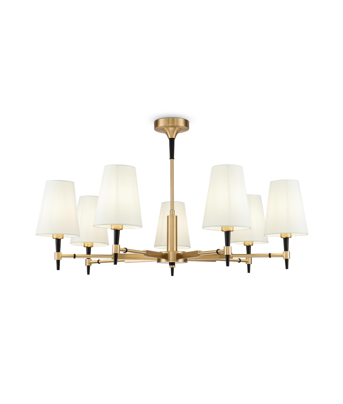 Lámpara estilo clásico renovado modelo Zaragoza. Acabado en color blanco, dorado y detalles en negro. Fabricado en metal y tulipa textil. Voltaje 220-240V y fuente de luz por 7 bombillas E14 MÁX 40W (no incluida).