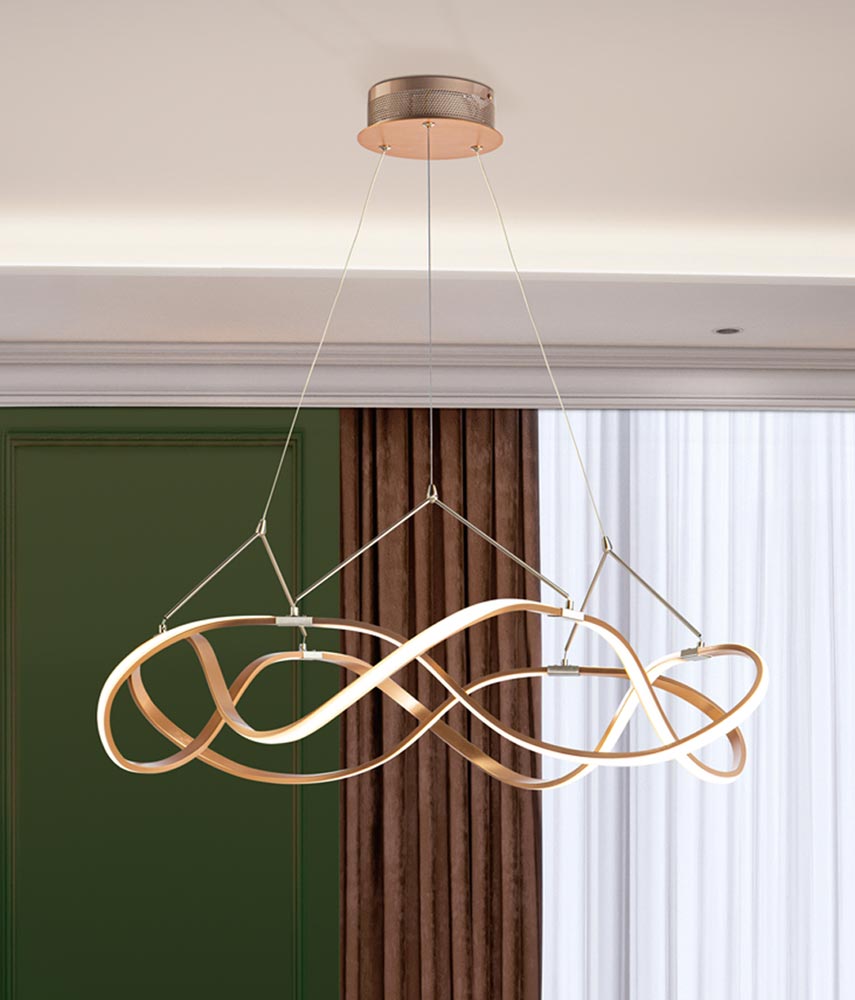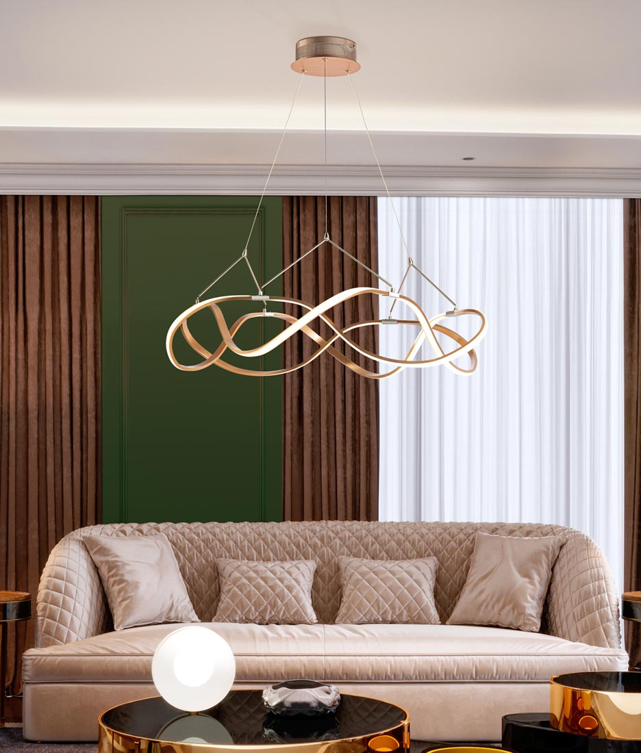 Lámpara elegante moderna, modelo MOLLY LED. Ideal para la iluminación decorativa de interiores. Acabado en oro rosa y detalles cromo. Fabricada en metal, aluminio y difusor de silicona. Voltaje 110-240V y fuente de luz LED 45W luz cálida 3000K 4050Lm (incluida).