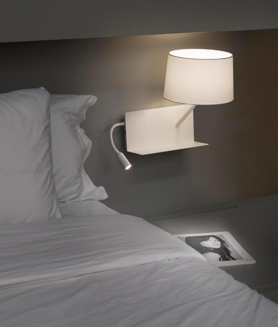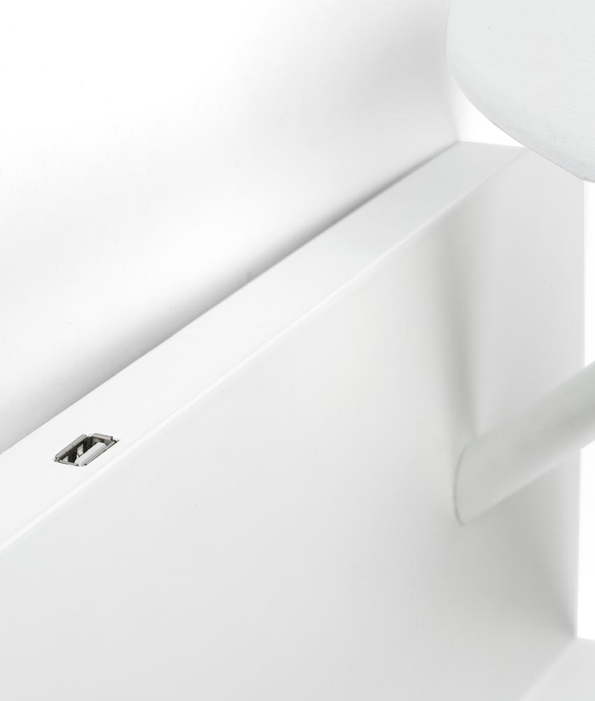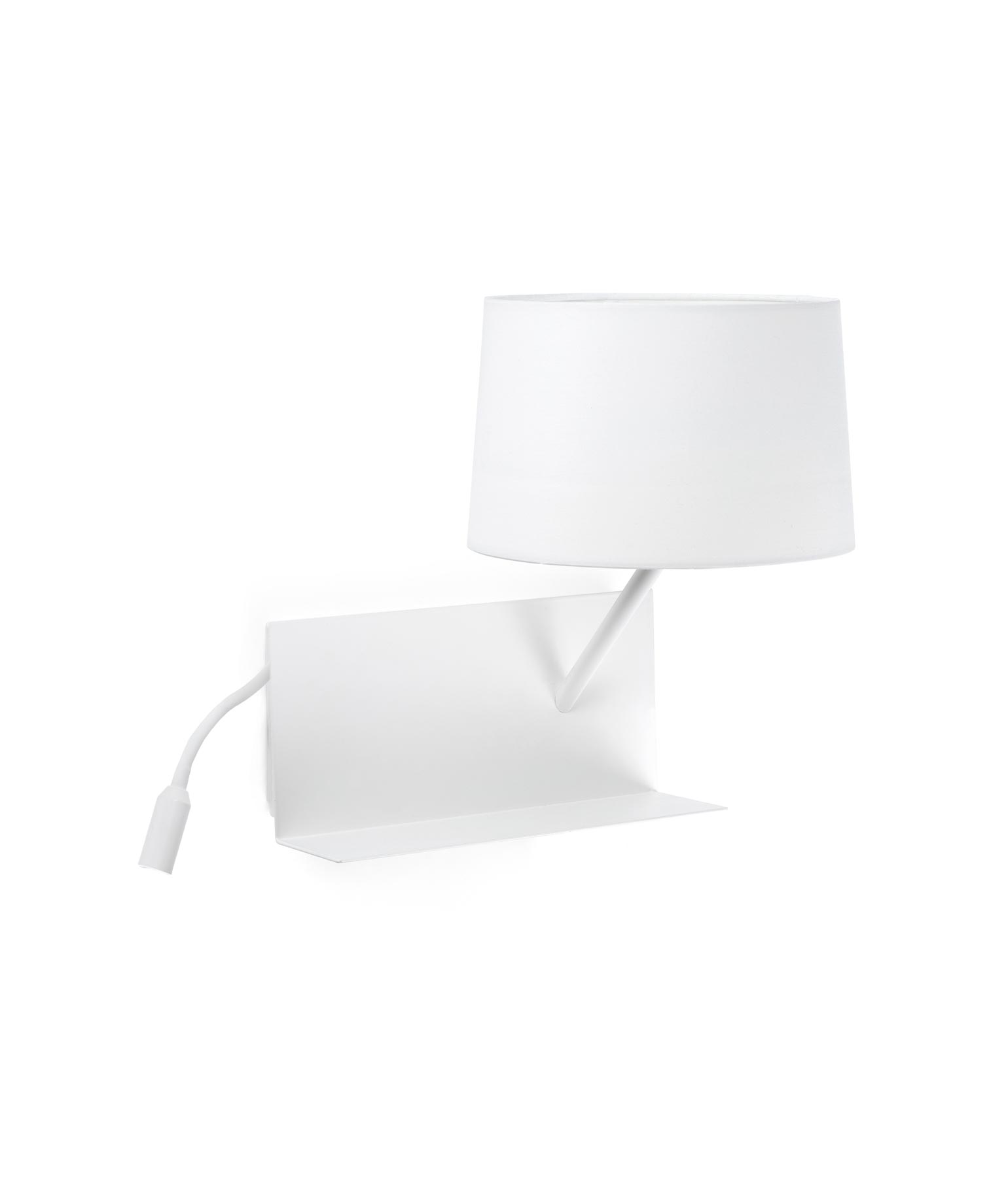 Lámpara aplique con lector LED derecha HANDY blanca. Aplique de pared con lector LED a la derecha de la marca Faro. Diseño de estilo minimalista y muy urbano, ideal para la iluminación interior del hogar. Tiene entrada de USB y estante para poner el móvil o un libro ahorrando espacio en la mesita de noche. Fabricada en acero y pantalla textil. Acabado en blanco. Iluminación por 1 x E27 MAX 20W (no incl.) + HIGH POWER LED 3W (incl.). Transformador driver incluido.