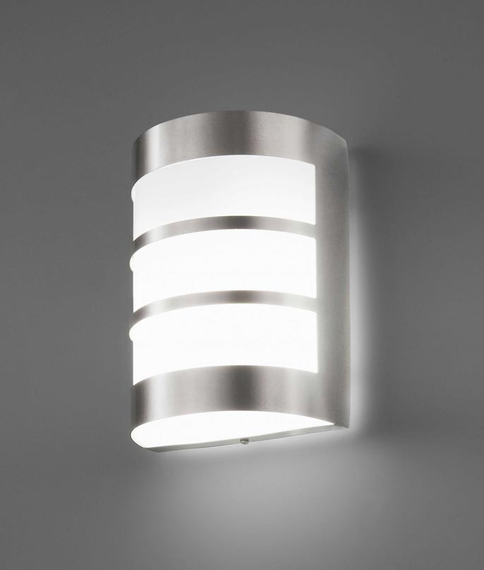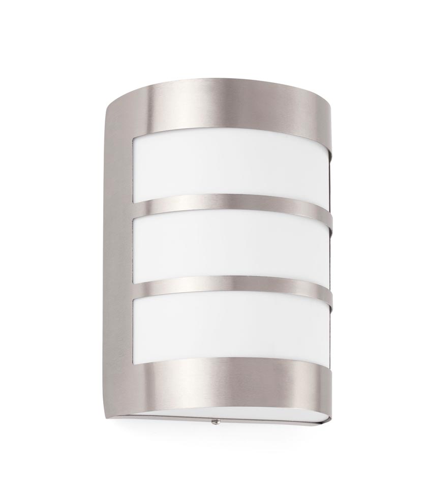 Lámpara aplique de pared para la iluminación exterior. Acabado níquel mate modelo CELA-2. Diseño moderno. Fabricado en acero inoxidable 304 y difusor de policarbonato opal. Voltaje 100-240V y fuente de luz 1 x E27 15W (no incl.).