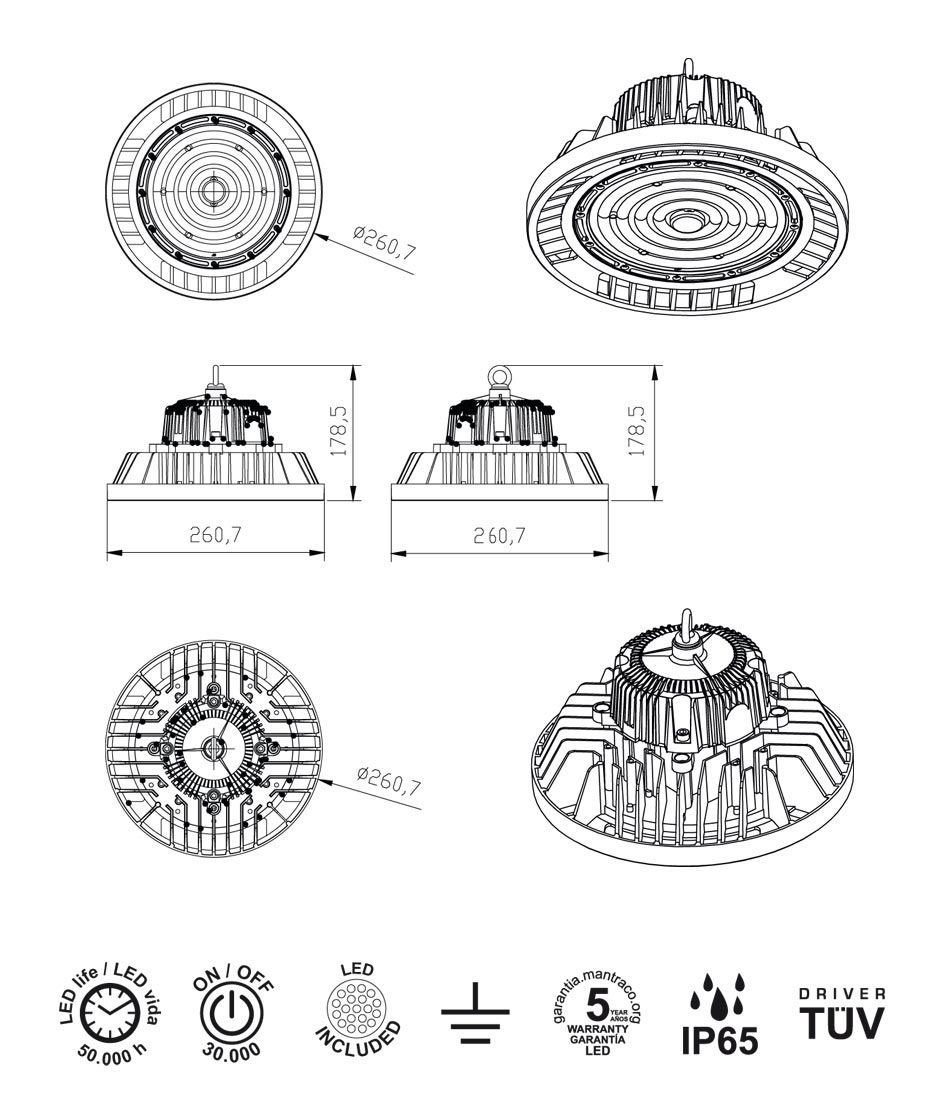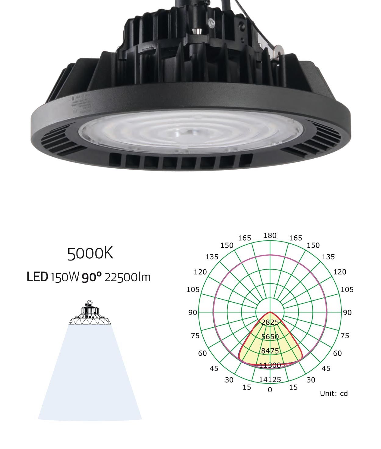 Campana industrial de alto rendimiento lumínico LED para industria o almacenes, modelo URANO. Ideal para la iluminación profesional y técnica. Alta protección IP65. Fabricado en aluminio. Acabado en color negro. CRI>80. Apertura de la luz 90º. Voltaje 180-260V – 50/60Hz y fuente de luz LED 150W luz fría 5000K 22500Lm (incluida). Duración hasta 50.000 horas. Encendido y apagado 30.000. Driver TUV incluido.