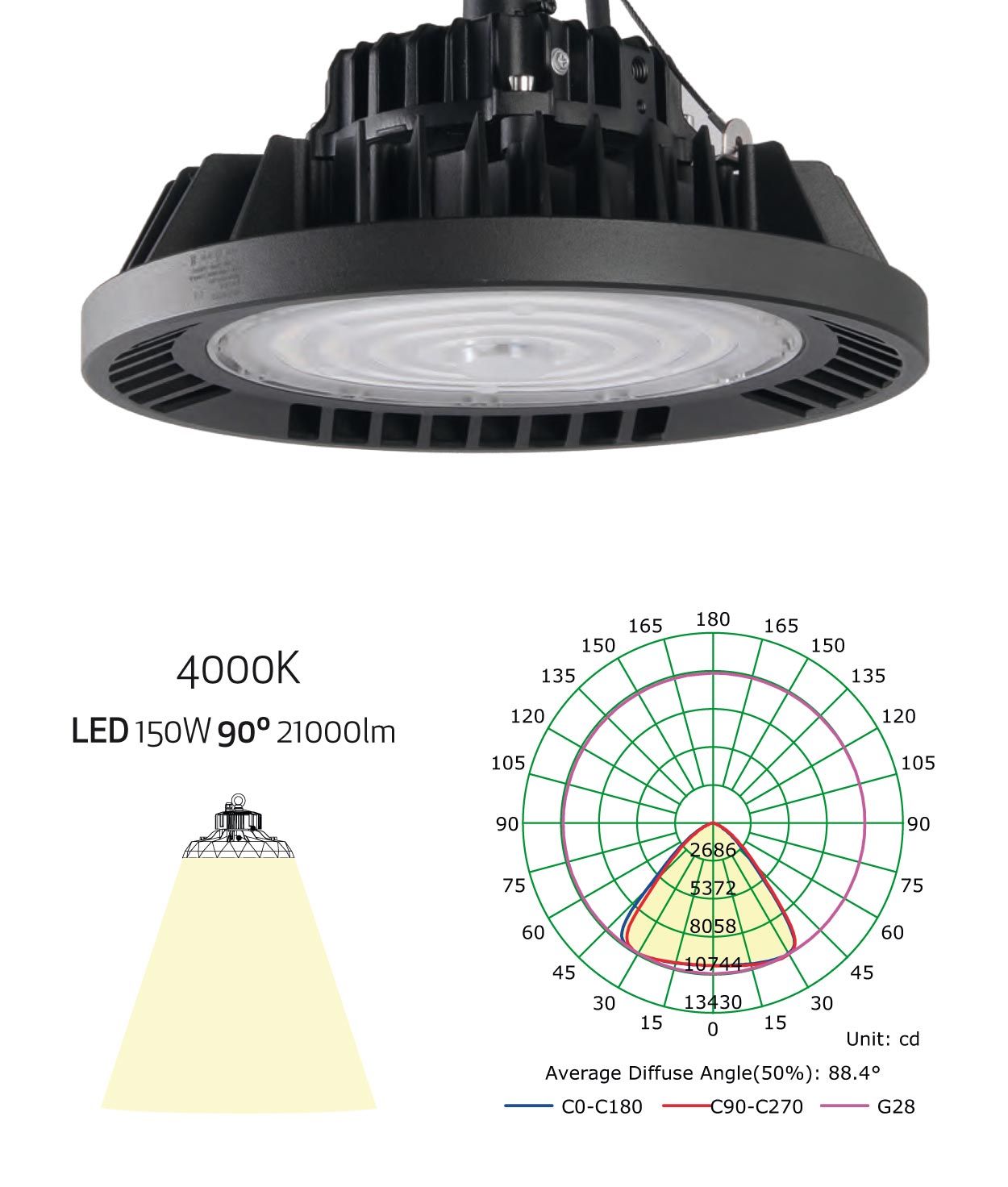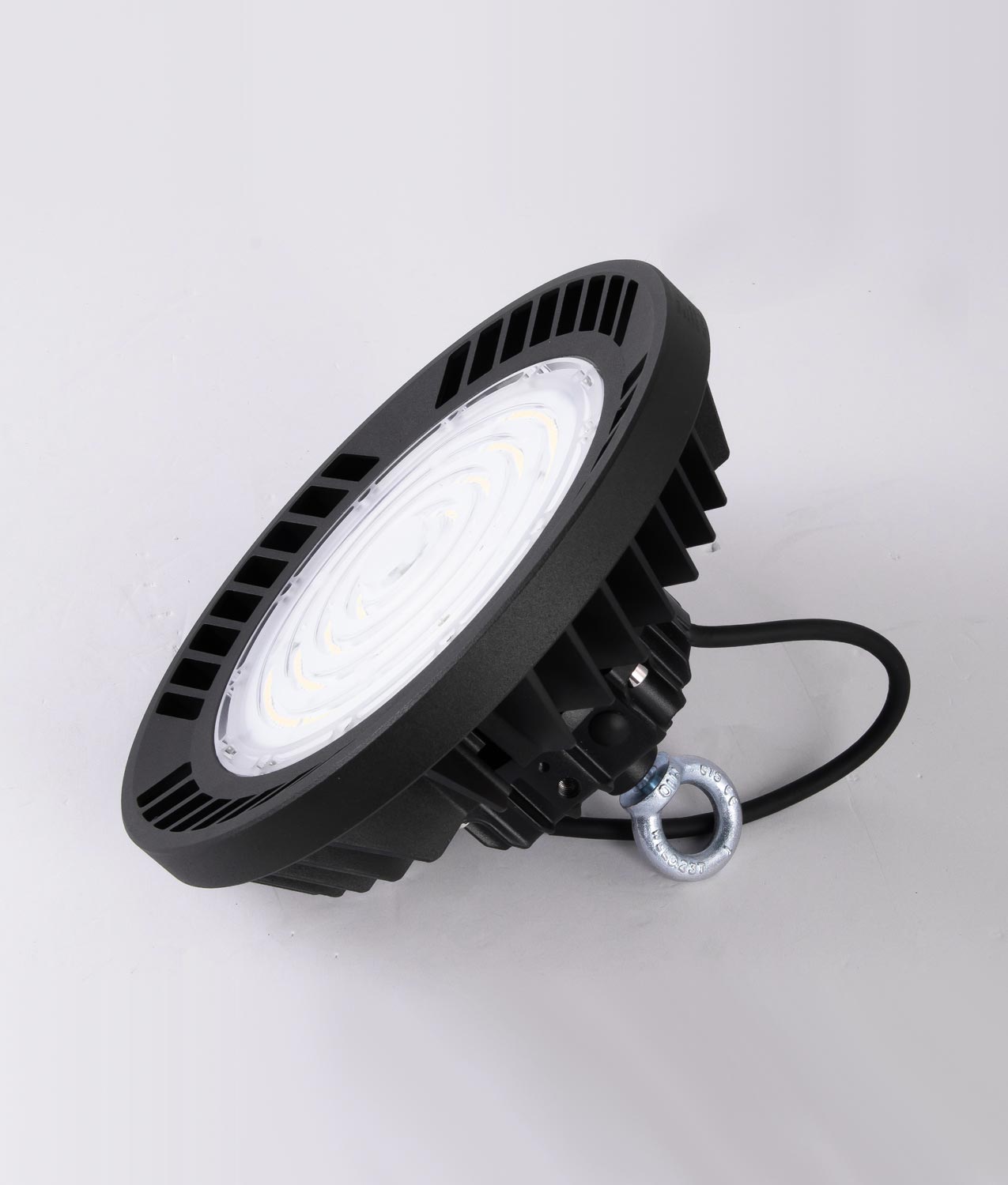 Campana industrial de alto rendimiento lumínico LED para industria o almacenes, modelo URANO. Ideal para la iluminación profesional y técnica. Alta protección IP65. Fabricado en aluminio. Acabado en color negro. CRI>80. Apertura de la luz 90º. Voltaje 180-260V – 50/60Hz y fuente de luz LED 150W luz neutra 4000K 21000Lm (incluida). Duración hasta 50.000 horas. Encendido y apagado 30.000. Driver TUV incluido.