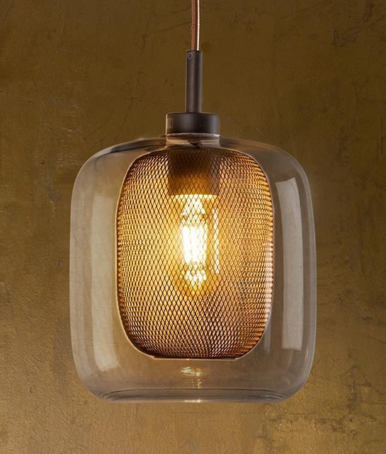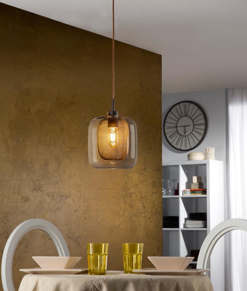 Lámpara de diseño rústico, modelo FOX. Ideal para la iluminación decorativa de interiores. Fabricado en metal y doble tulipa de cristal y otro de malla metálica. Acabado en color chocolate. Fuente de luz cálida por 1 bombilla E27 LED 8W regulable 2700K (no incluida). Voltaje 110-220V.