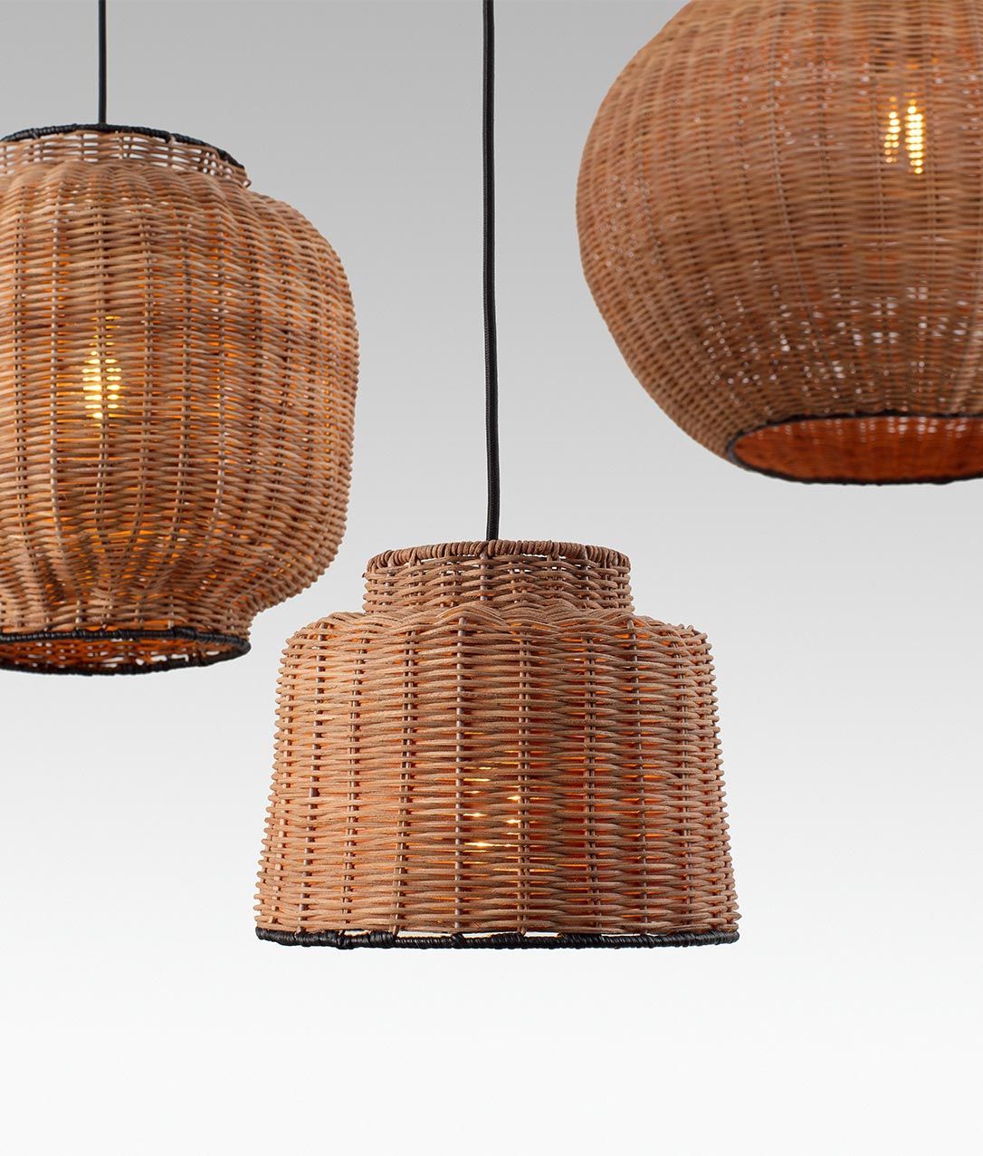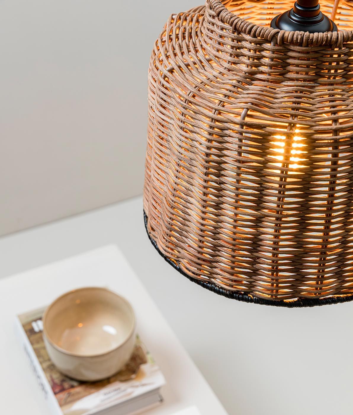 Lámpara colgante de 22,5 cm de diámetro de diseño estilo rústico, modelo SAIPAN. Ideal para la iluminación interior de todo tipo de espacios. Acabado en color negro y ratán. Fabricada en acero y tulipa de ratán. Voltaje 100-240V y fuente de luz por una bombilla E27 máx. 15W LED (no incluida).