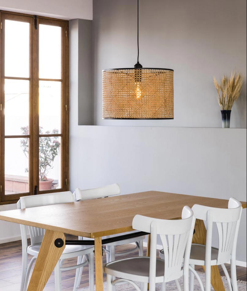Lámpara colgante de 45 cm de diámetro de diseño estilo rústico y tradicional, modelo MAMBO. Ideal para la iluminación interior de todo tipo de espacios. Acabado en color negro y ratán. Fabricada en acero y tulipa de ratán. Voltaje 100-240V y fuente de luz por una bombilla E27 máx. 15W LED (no incluida).
