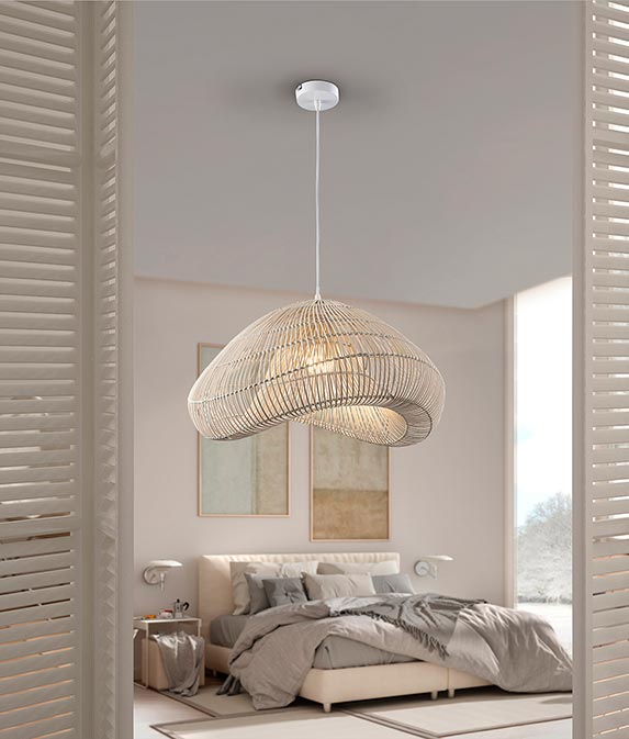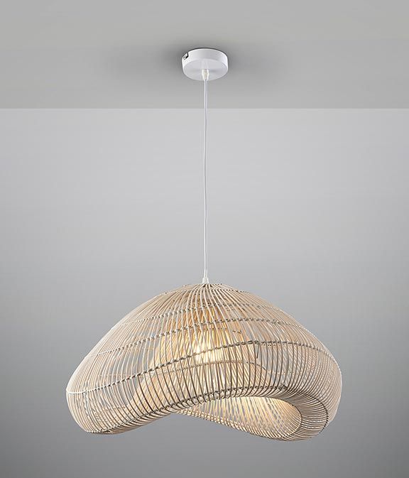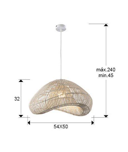 Lámpara de techo modelo Sabah. Acabado en color blanco. Fabricada en metal y ratán. Voltaje 110-220V y fuente de luz por 1 bombilla x E27 8W LED luz cálida 2700K 870Lm (incluida).