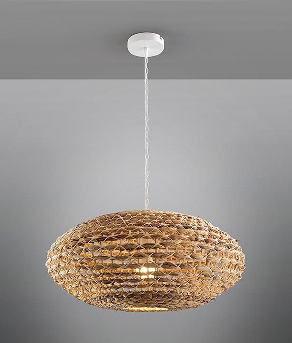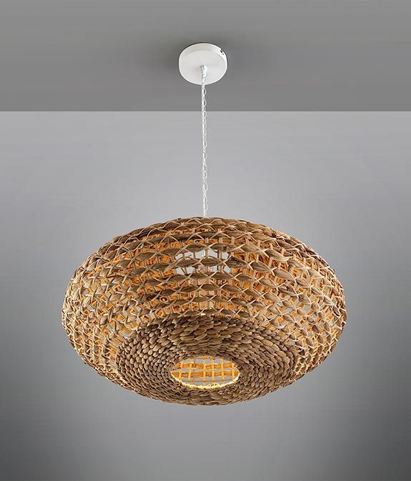 Lámpara de techo acabado natural ratán y jacinto de agua trenzado modelo Nana. Acabado en color blanco y ratán. Fabricada en metal, ratán y jacinto de agua. Voltaje 110-220V y fuente de luz por 1 bombilla x E27 10W LED luz cálida 3000K 900Lm (incluida).