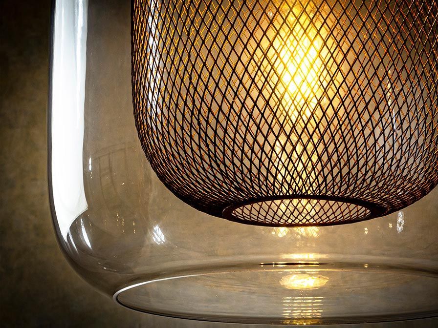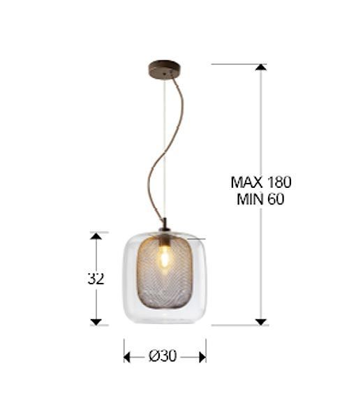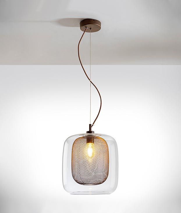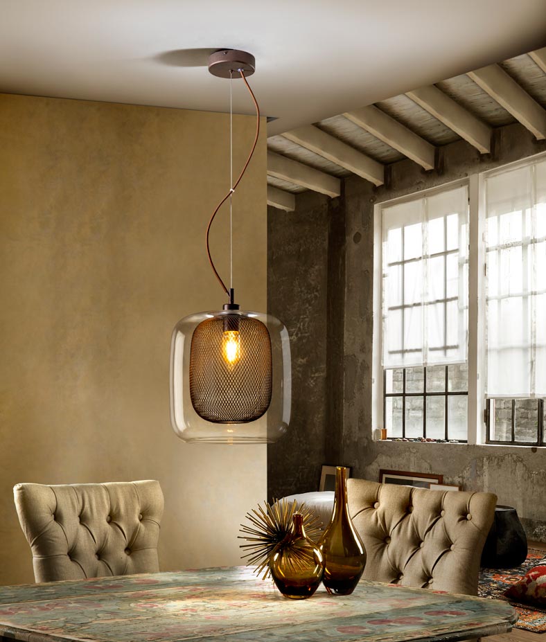 Lámpara de techo de diseño rústico, modelo FOX. Ideal para la iluminación decorativa de interiores. Fabricado en metal y doble tulipa de cristal y otro de malla metálica. Acabado en color chocolate. Fuente de luz cálida por 1 bombilla E27 LED 8W regulable 2700K (no incluida). Voltaje 110-220V.