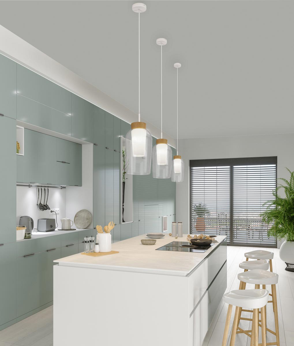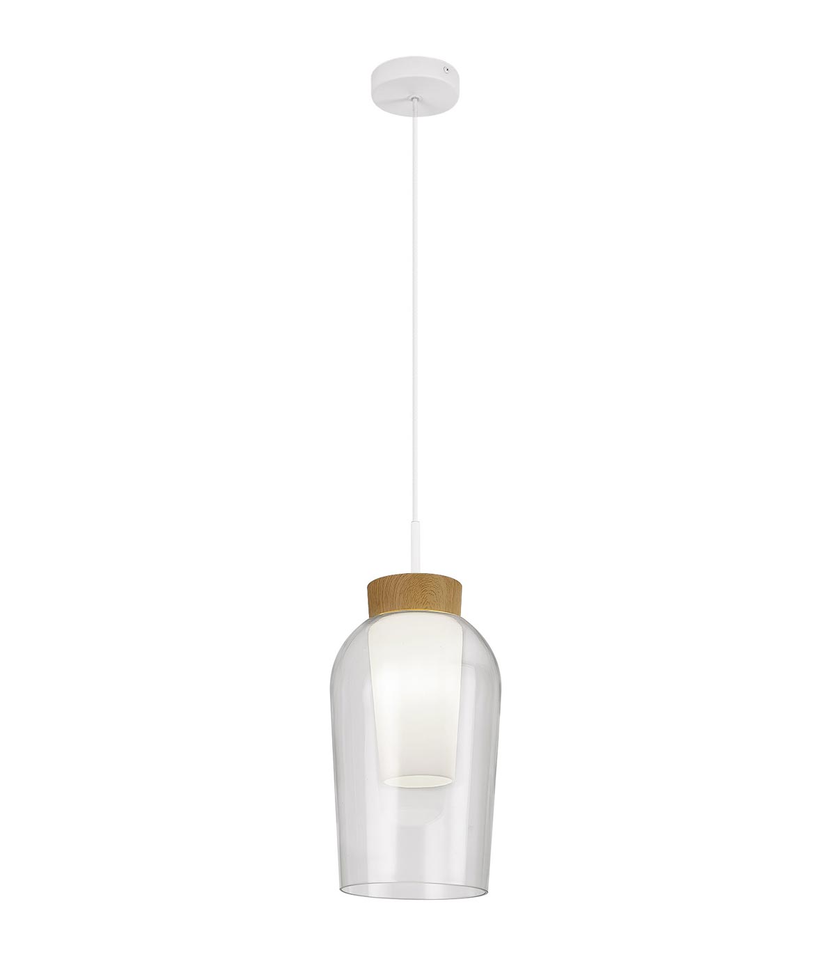 Lámpara de cristal modelo Nora. Acabado en color transparente y blanco. Fabricado en metal, madera y cristal. Voltaje 220-240V y fuente de luz por 1 bombilla E27 MÁX 20W LED (no incluida).