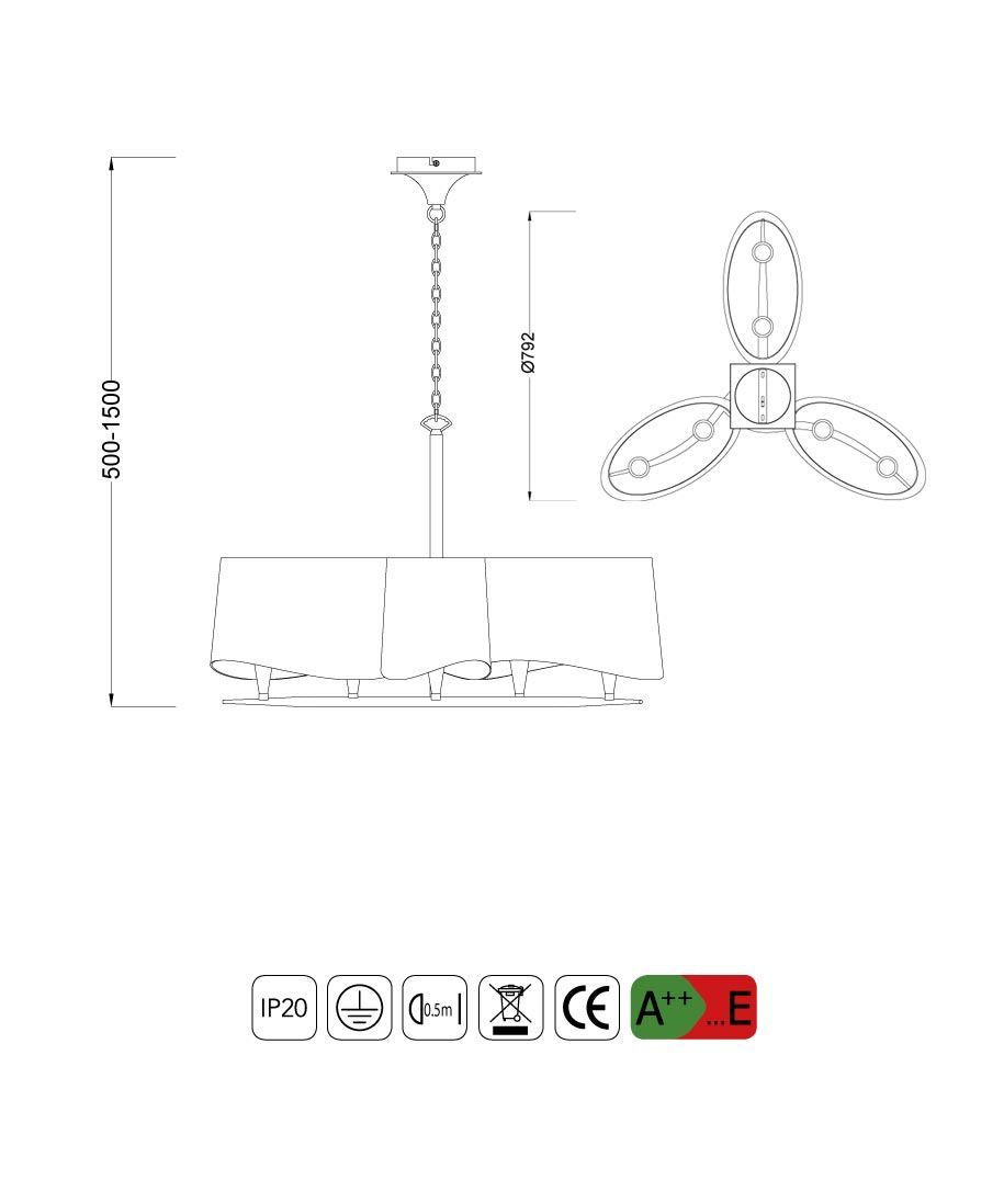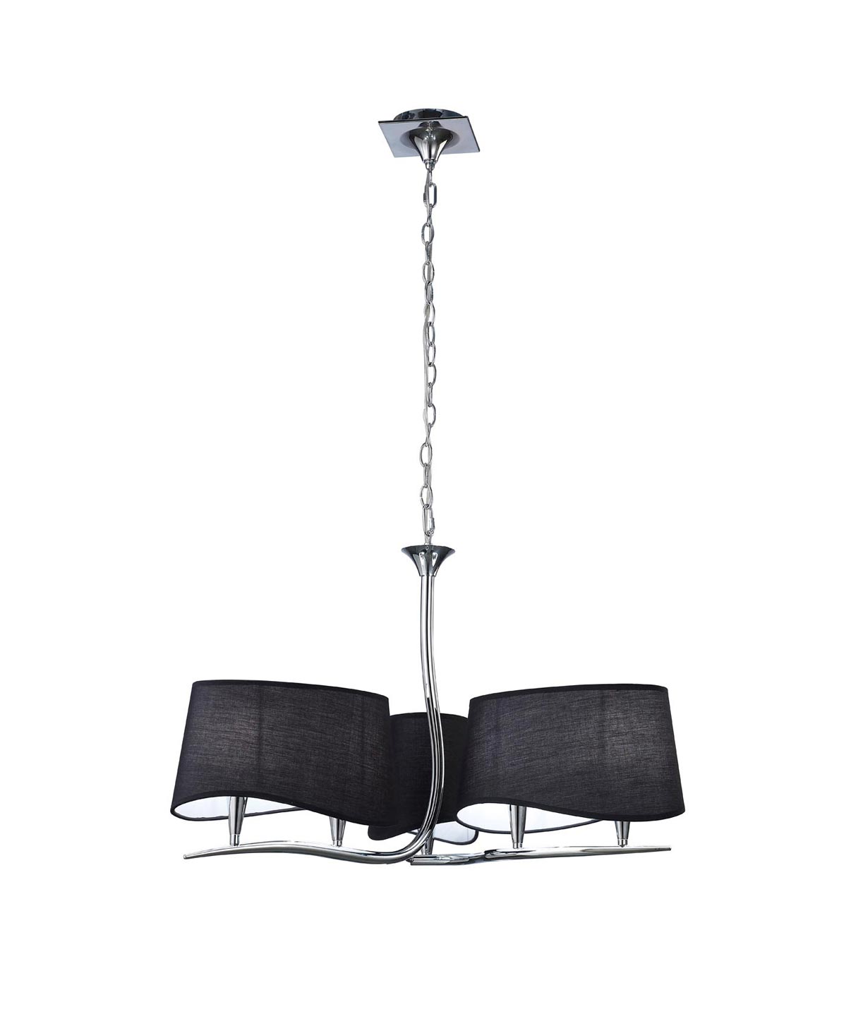 Lámpara cromo negro NINETTE con acabado en cromo y pantallas en negro (2 pantallas). Iluminación mediante 6 luces E14 (no incl.). Modelos disponibles en dos acabados: acabado cromo (con pantallas negro y crudo) y el cuero (pantallas en crudo).